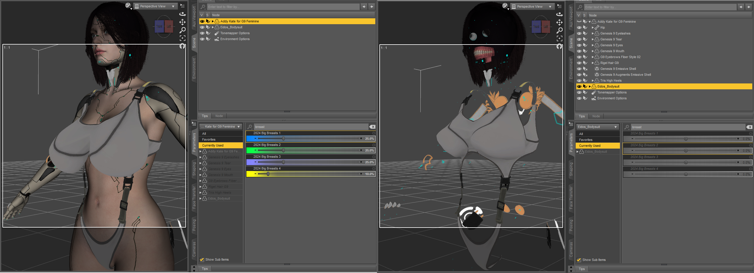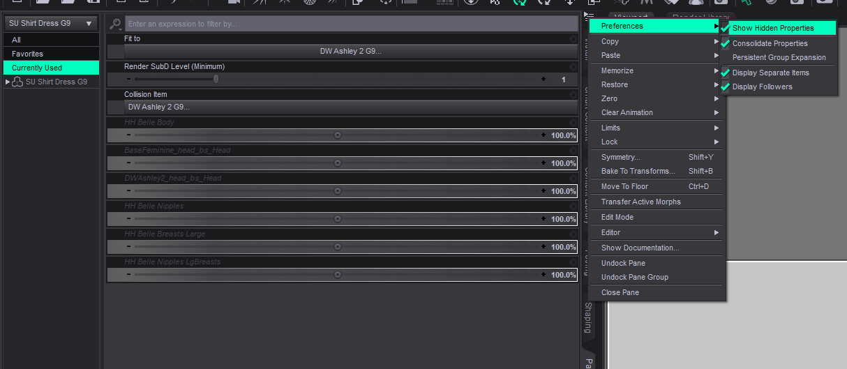 >>1019810I do have hidden properties visible. It could be the base character morph causing the distortion even with breast morphs zeroed. My goal is to have bodysuit conform/auto-fit to everything except the breasts. I suppose I could smooth it out in Blender via sculpting.