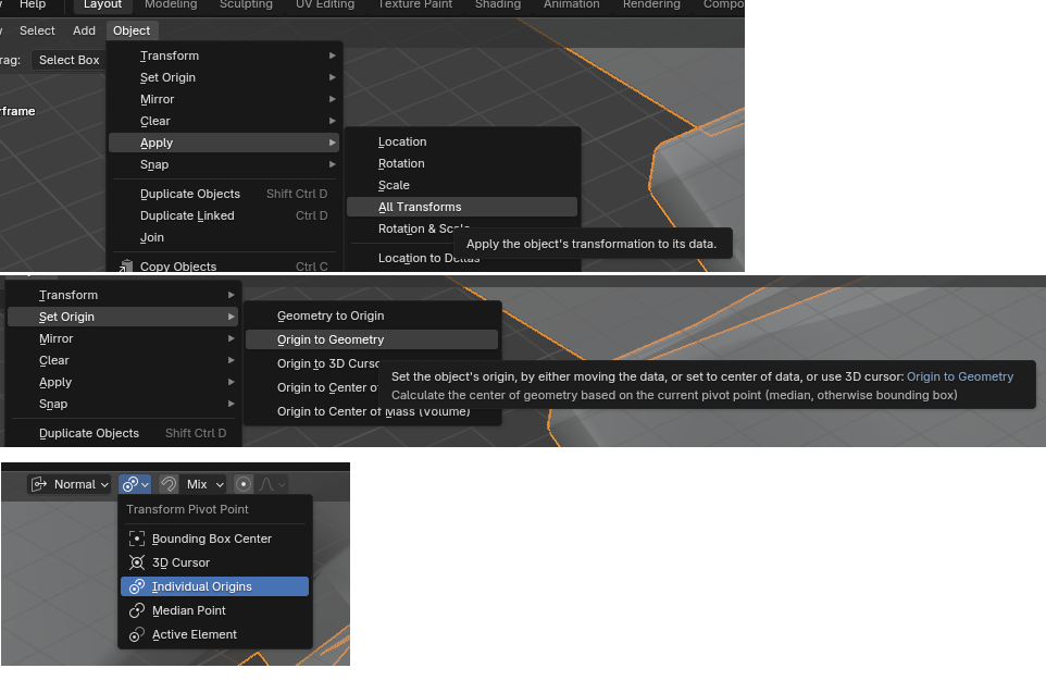 >>1025717yeah that's one of the weirdnesses with blender: it remembers transformations and does weird (possibly useful, but confusing) stuff. For the weird scaling/rotating behavior, you have to apply the transformations.For placement of the gizmo, you can set the origin to the geometry, or just use change the transform pivot point - blender has the aforementioned "3D Cursor" (the red/white circle), which you can also use as a pivot point