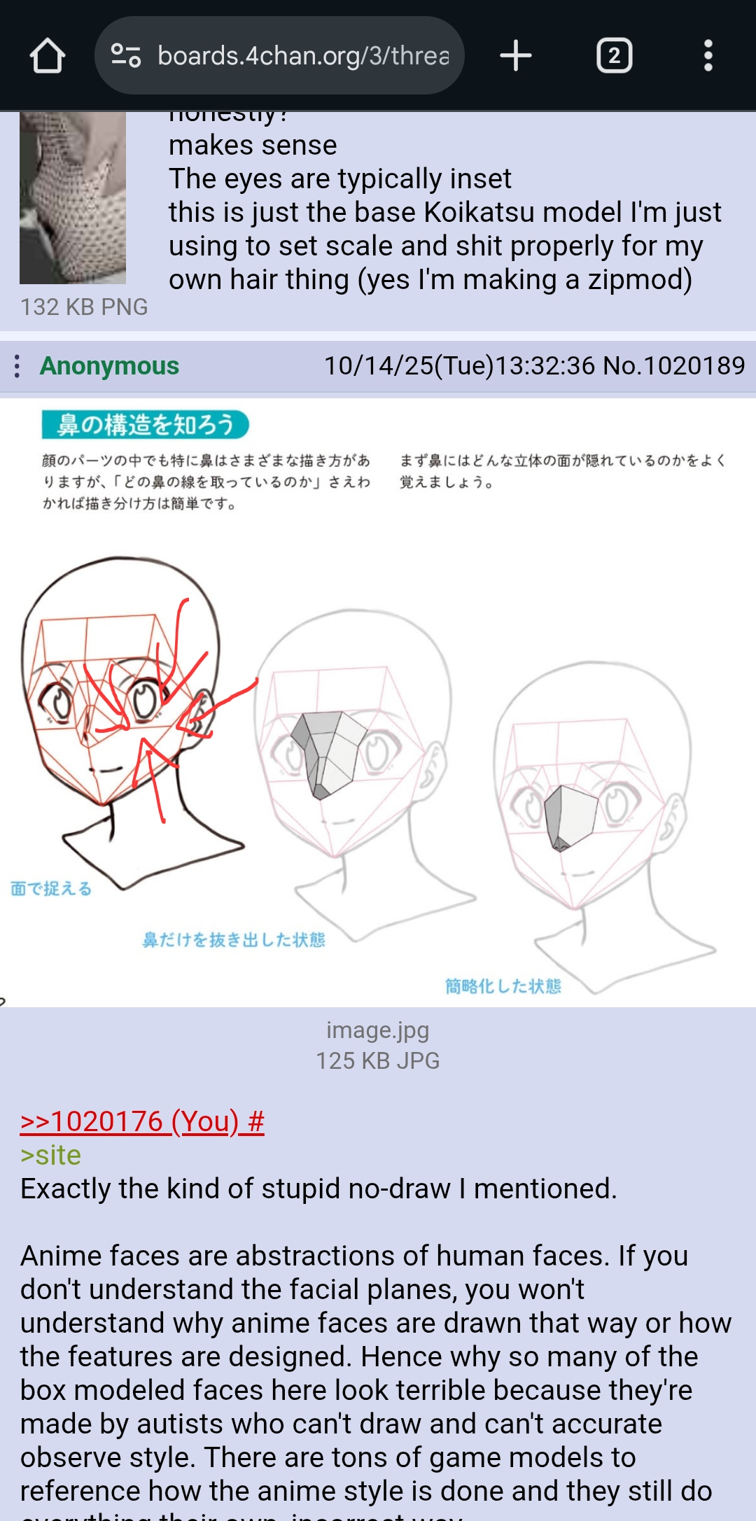 >>1020176>siteExactly the kind of stupid no-draw I mentioned.Anime faces are abstractions of human faces. If you don't understand the facial planes, you won't understand why anime faces are drawn that way or how the features are designed. Hence why so many of the box modeled faces here look terrible because they're made by autists who can't draw and can't accurate observe style. There are tons of game models to reference how the anime style is done and they still do everything their own, incorrect wayPic related from Date Naoto - Deconstruction Illustrated