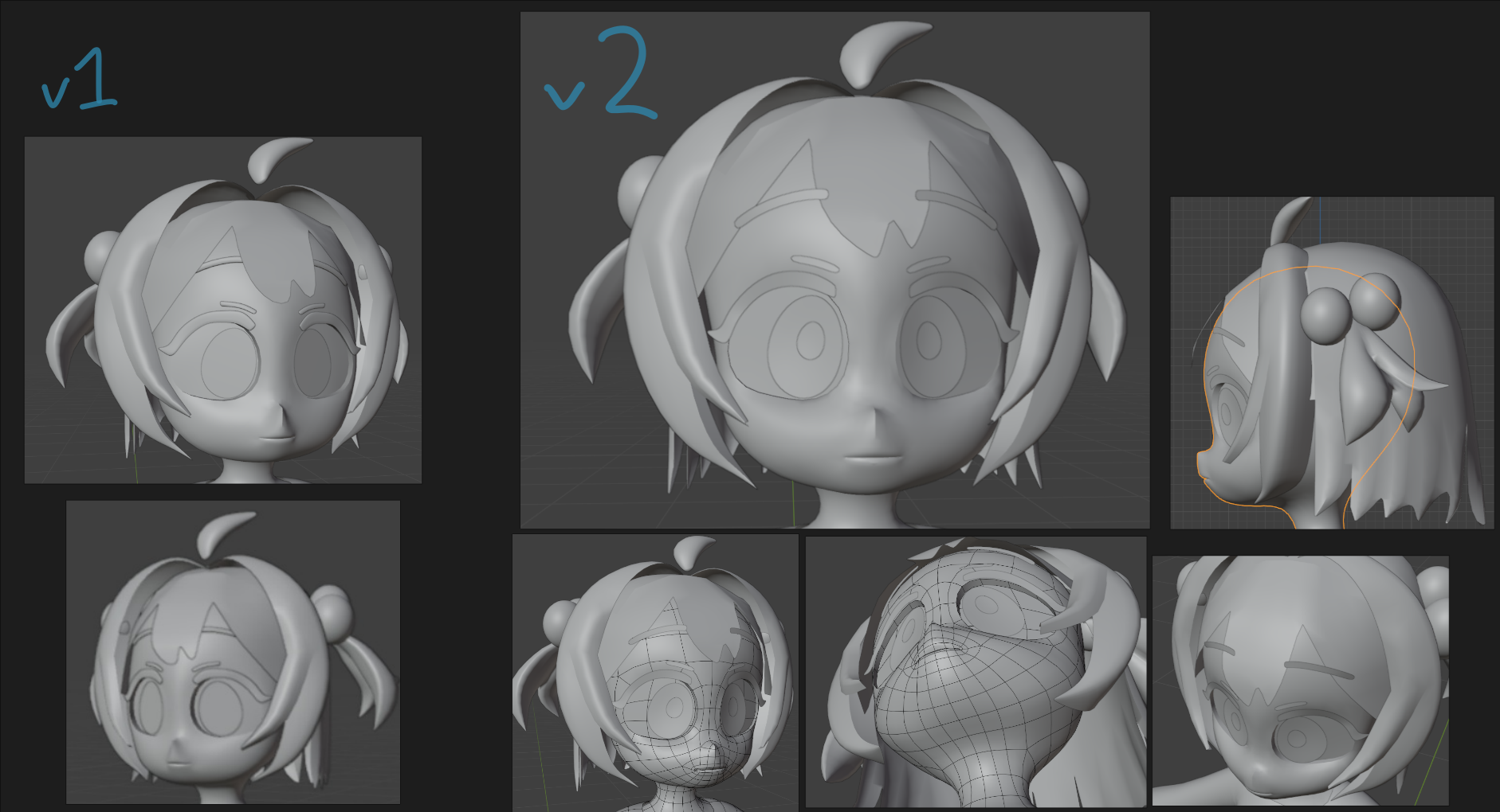 Recently finished this model that turned out so great i need to share it. works in vrchat and made a bunch of cute expressions and some toggles for her there. Im pretty happy with the quality of my models but ive got absolutely no clue about the communities or kinda market there is if i were to pursue commissions so i wanted to ask here. What kinda money would people actually pay for models like this? And what socials should i go on to share my work? Any advice or thoughts are appreciated.>>1020099I'm a curve abuser so i don't have any optimized advice but try adding some complimentary hairs, just flat geometry on a curve to break the shape a lil. Also making a braid irl from shoelaces to see the shape better.>>1020104don't mimic the image too closely, your reference has a slight upwards tilt so you cant see the jawline and your model has quite an underbite. Try finding some other angles of a face shape you like and just look at the curves of its silhouette. maybe lower the eyes and puff the cheeks for a little squishier face but shes actually pretty cute already! Could be best to see her with some colour.