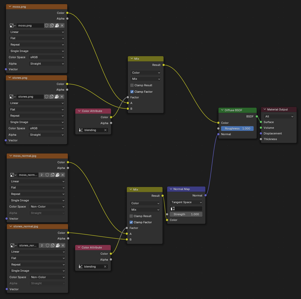 >>1023905Kept running into issues today. The interpolation looked bad, and I couldn't figure out why. After combing through the node group a couple dozen times, I'm about 80% sure that going full voronoi is giving bad interpolation. I should have noticed it yesterday. I could have sworn it was working fine yesterday.But in any case, I figured out how to make it work again. But removing the dual mesh node, and keeping the delaunay triangulation. That interpolates cleanly. Because the edges are directly between the points. Where the voronoi fails, is that the cells it generates interpolates slightly differently than the edges of the triangulation. That difference is not huge, and intuitively it doesn't feel like a big deal. But the slight difference ended up mattering a huge deal.So yeah. The extra functionality I wanted to implement has to be reconsidered. Since I was thinking in terms of voronoi cells. Now I'm forced to figure out how to do it with the triangulation. Supposing it's even possible.
