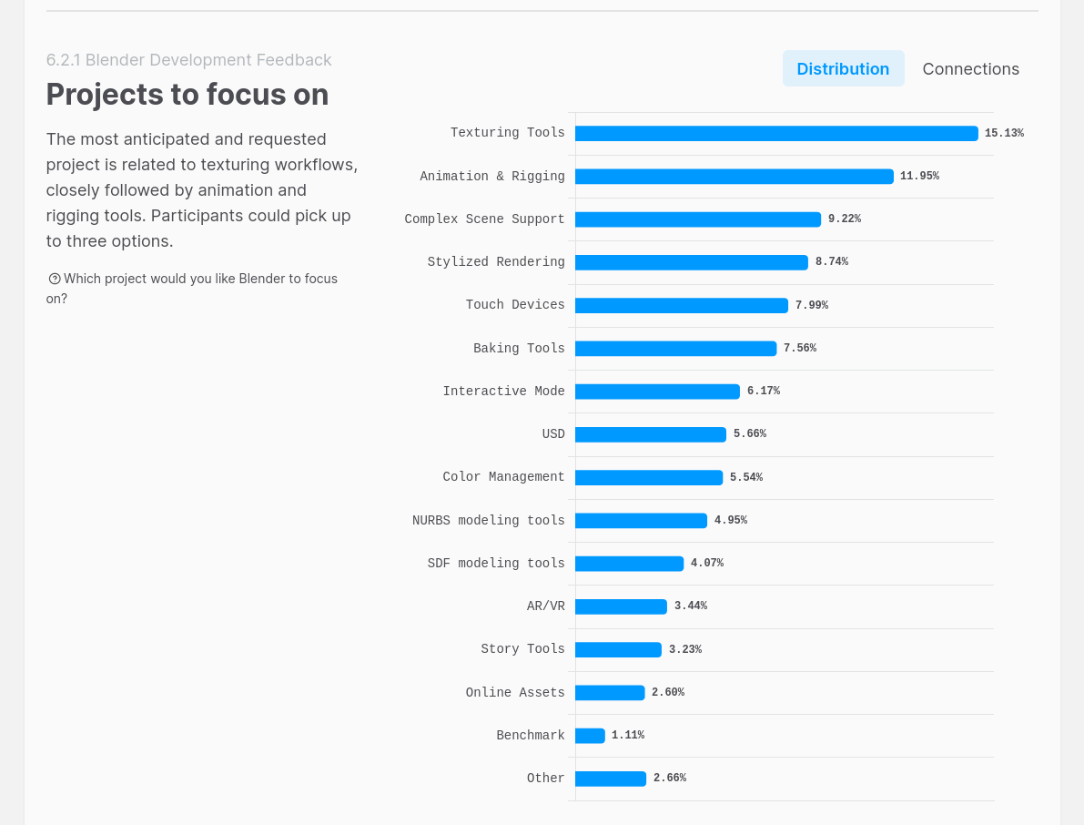 So it is survey time: https://survey.blender.org/feedback/2025/PositiveUsers in this category expressed gratitude, excitement, and satisfaction with the current state of the software and the development team.General Appreciation:Overwhelming gratitude for the software being free and open-source. Many comments simply stated, "You guys rock," "Best 3D software," and "Thank you for changing my life."Development Speed:Several users are impressed by how quickly features are added (e.g., "taken aback by how quick development has been as of the past 3 or 4 years").Geometry Nodes:Significant praise for the power and potential of Geometry Nodes as a foundation for future tools.Community & Transparency:Users value the open communication, the "Blender Today" streams, and the feeling of being part of a family.Specific Features:Cycles: Praise for the addition of ACES and general rendering quality.Modeling: Many users feel the modeling tools are strong and improving.Portability: Excitement for the move toward Apple Silicon support and potential iPad versions.Vulkan: Transition to Vulkan was noted as a positive step by technical users.Comparisons:Users frequently mentioned Blender allows them to escape paid subscriptions and that it competes well with industry standards.