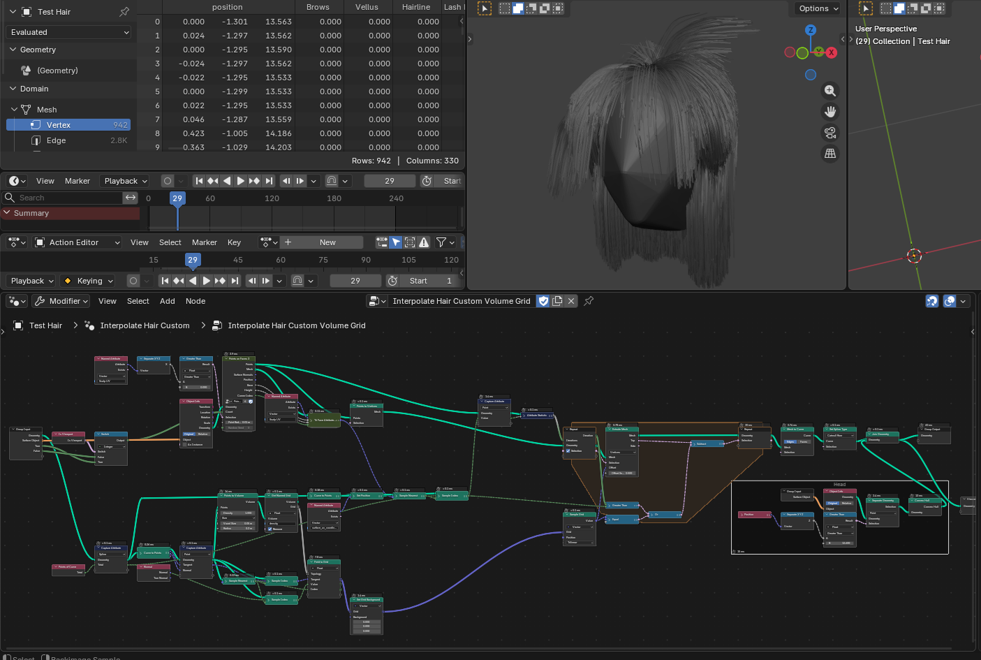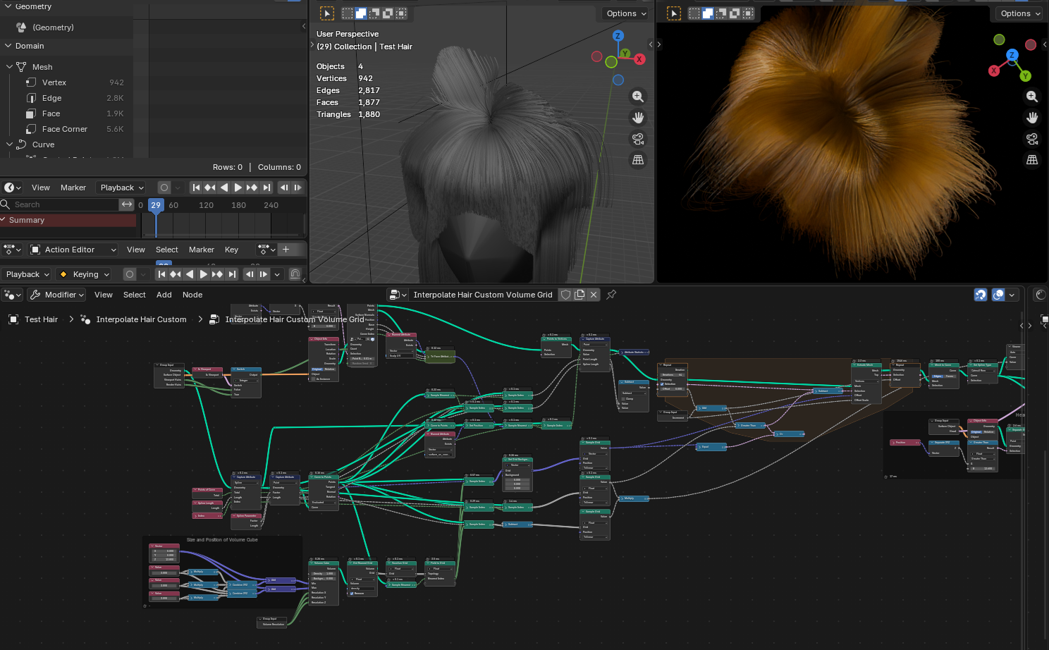 >>1024045A technically better set up, but still not the results I'm looking for.I realized that starting with a standard volume cube was what I wanted all along. Voxelize it, then have it sample the nearest points of the guide curves. Then using the index of the nearest points, sample the tangent of the curves. That gives you the general map for the extrusion. Perform the extrusion, and then all the curves go where they're supposed to go.A few issues though: voxels only interpolate to their next door neighbors. I was hoping for a wider blend. A gradual blend of attributes over many voxels. But no, it doesn't work that way. At least, not to my knowledge. But what this means, is that hair closer to the scalp are interpolating pretty much perfectly. But the farther away from the scalp the hair is, the less it interpolates. This makes clumping around parent curves too obvious. By lowering the voxel resolution, it forces more wide spread blurring. But it also loses the detail of the overall shape of the hair.Also, in order to get the extrusion to be nice and tight, it has to extrude in small increments. Larger increments cause the hair to overshoot and fly away, appearing all frizzed out and unkempt. Which mean that many more control points need to be created, which bloats and slows down the node a great deal.If I can figure out solutions to these issues, then using volume to create hair might be the best thing ever. But if I can't figure out solutions, then I'll have to abandon the idea.