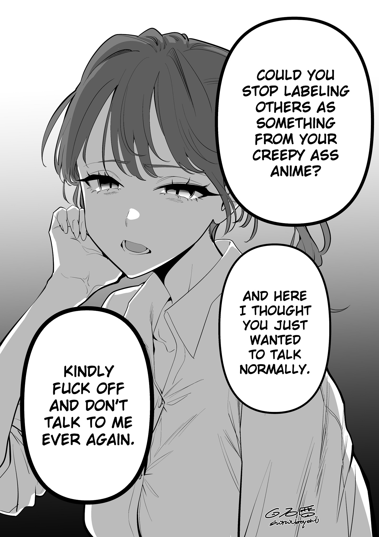 >>287340445>She's an obsessive otaku.She's clearly normal in class. Otaku-kun is a social outcast in class.