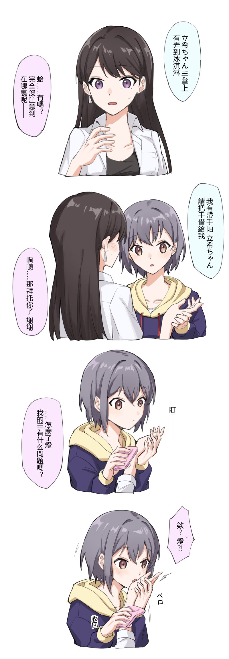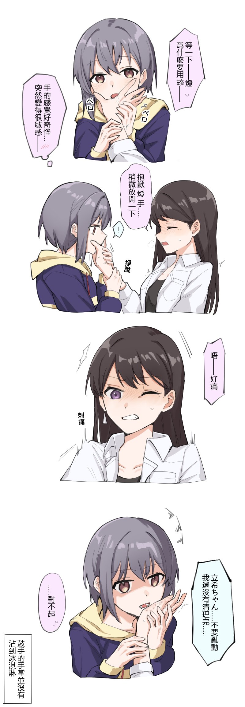 >>287474119>Taki-chan, you got some ice cream on your hand>Ha? Really? I didn't notice, where is it?>I have a handkerchief. Taki-chan, please lend me your hand. >mmhmm... I'll leave it to you then, thanks.>*jiii* (t/l this is the sfx for stare)>What's up Tomori? Is there something wrong with my hand?>Eh?! Tomori?!>>287474139>Wait a minute Tomori, why are you using your tongue? >My hand feels so strange and suddenly become super sensitive.>Sorry Tomori, please loosen your grip a bit>!>*brakes free*>Oh! That hurt!>*pain*>Taki-chan, don't suddenly move like that. I haven't finished cleaning your hand.>... Sorry>The drummer's palms never had any ice cream on them.