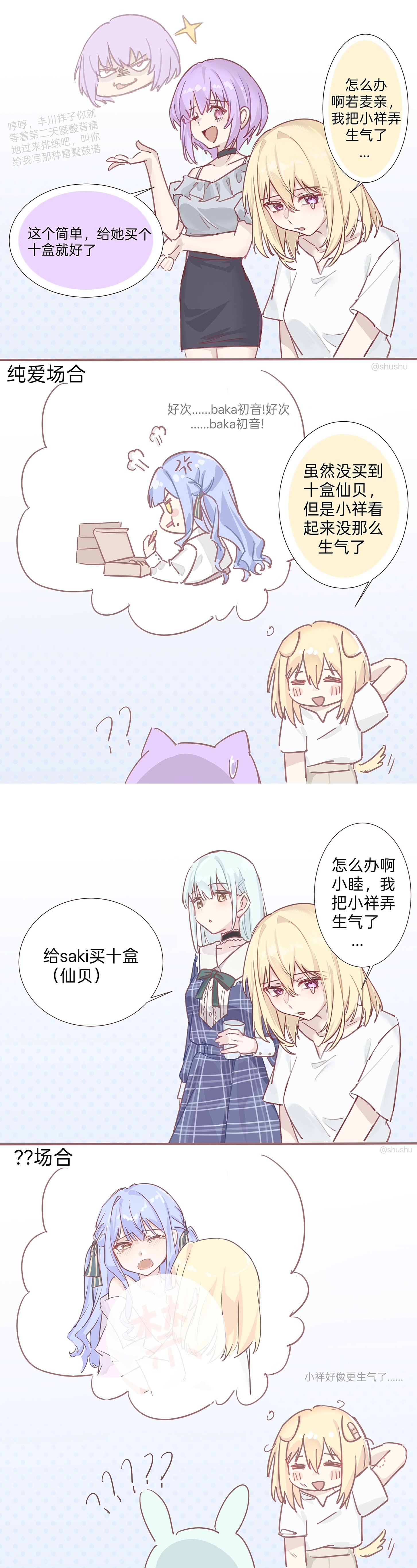 >>287474483>>287474296>H: What should I do, Nyamuchin? I made Saki-chan mad...>N: (Heheh, just you wait, Togawa Sakiko. Look forward to showing up to practice sore all over. Serves you right for writing such a brutal drum part.)>N: It's simple: get her 10 boxes.>When it's a pure love>S: Yum... baka Hatsune! Yum... baka Hatsune!>H: Even though I didn't get 10 boxes of senbei, it seems like she's not as mad anymore. >H: What should I do, Mutsumi-chan? I made Saki-chan mad...>M: Get Saki 10 boxes (of senbei).>When it's ????>H: I think Saki-chan is even angrier now...