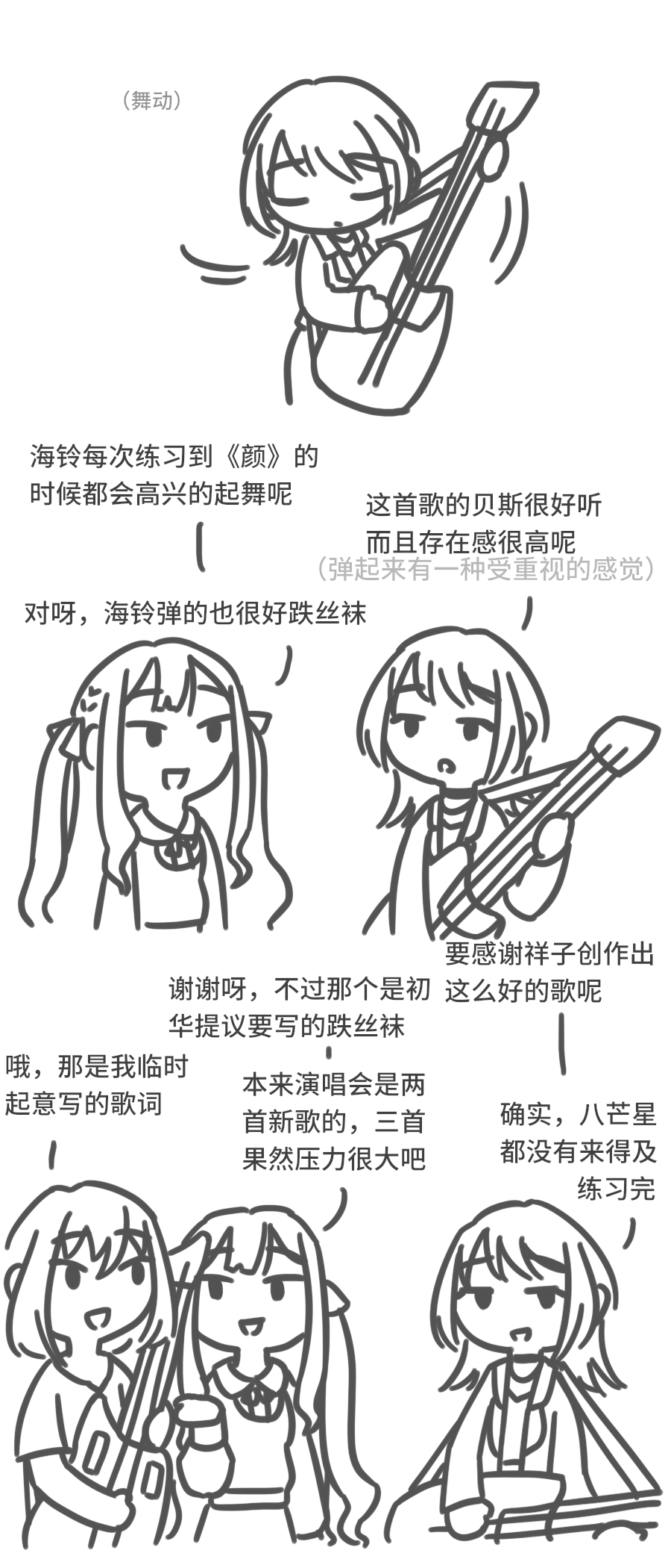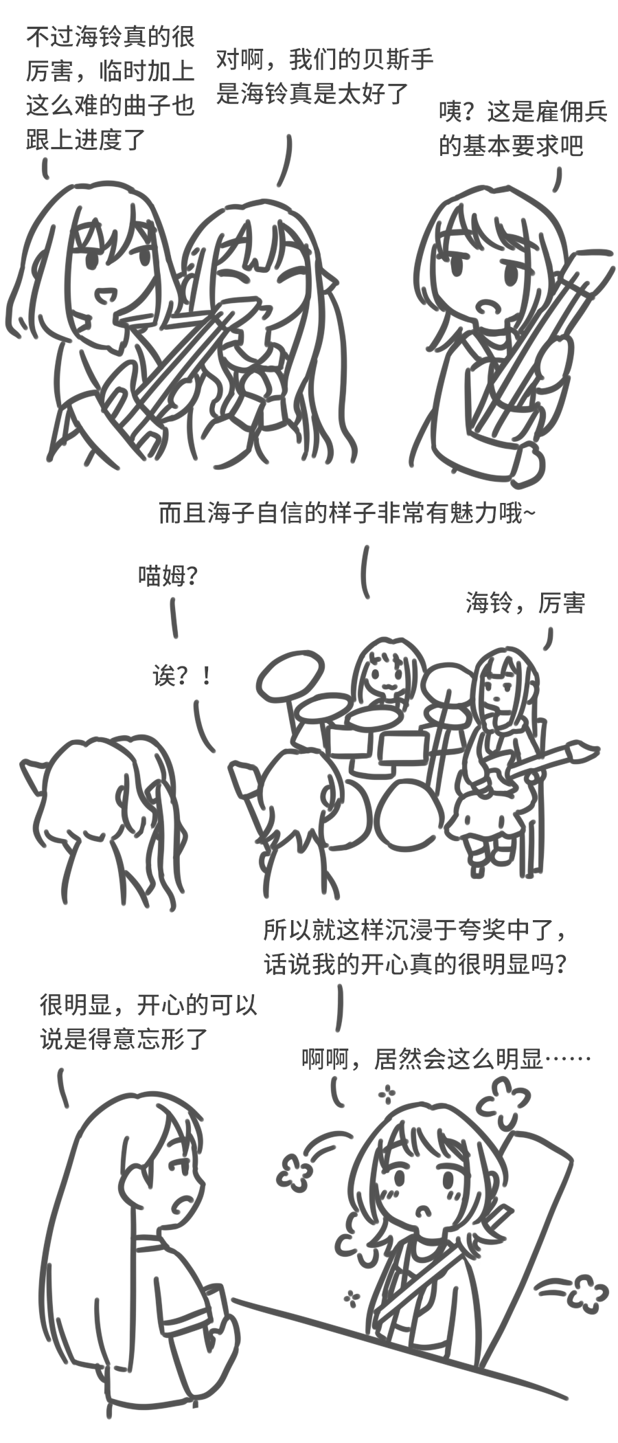 >>287478194>H: But Umiri is really quite something. You kept up, despite such a difficult piece suddenly being added in.>S: That's right. Our bassist is really wonderful. >U: Eh? Isn't that the most basic requirement of a merc?>N: Plus, Umiko's self-confidence exudes charisma~>U: Nyamu?>M: Umiri, great job.>U: Eh?!>U: And so, I was inundated in compliments. Say, is it super obvious how happy I am? >T: Extremely obvious. So elated you're over the moon. >U: Ahhh. So it was that apparent......