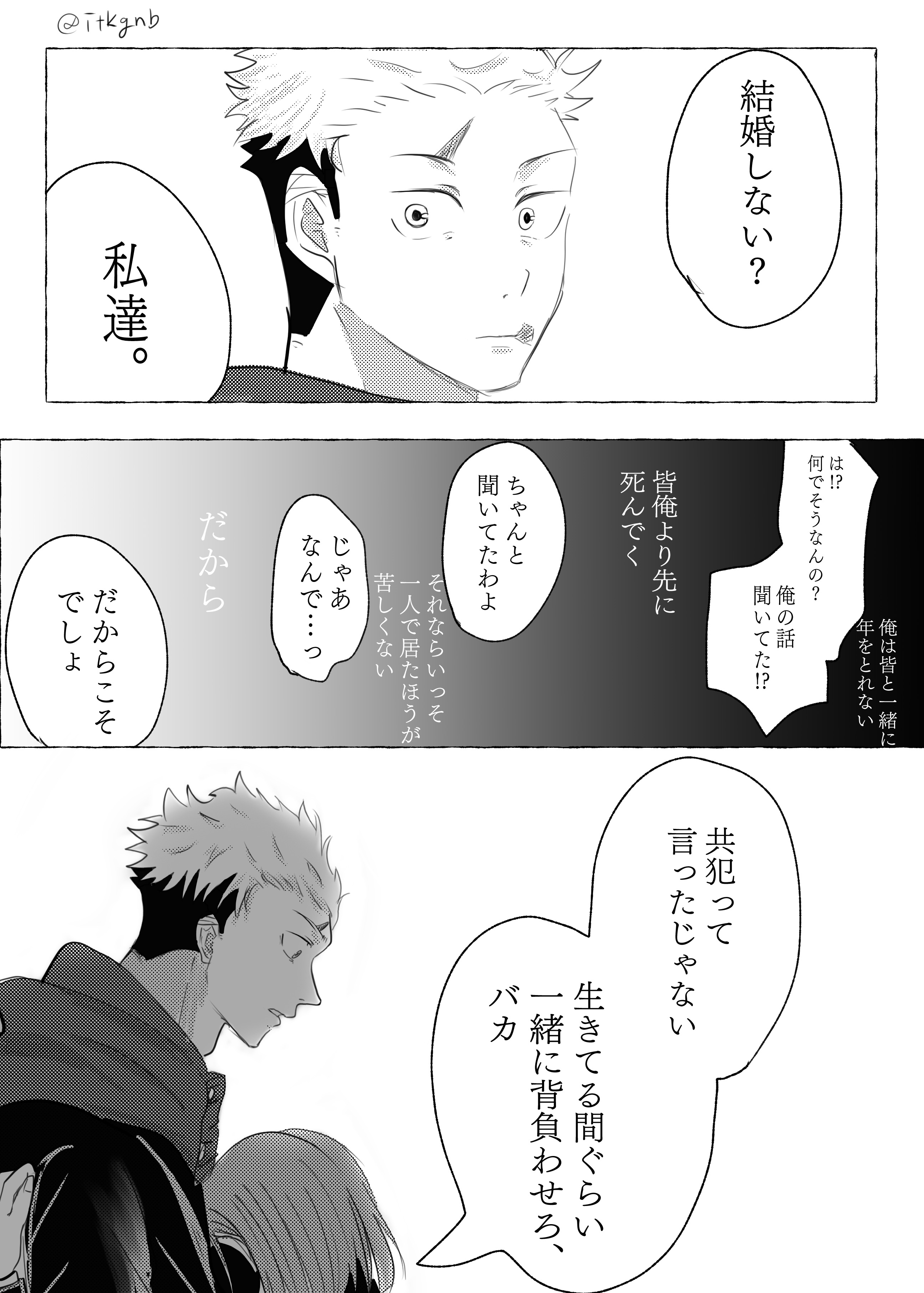 >N:Don't you want to get married?>N:You and I>Y:Ha!? What are you saying? Were you listening to me!?>Y:I can't grow old with all of you>Y:Everyone will die before me>N:I was listening carefully>N:'In that case, it would be less painful to just be alone'>Y:Then, why...>N:Because of that>N:It's precisely because of that>N:Didn't I say we were accomplices? Let me bear this burden with you, at least for the time I'm alive, you idiot.