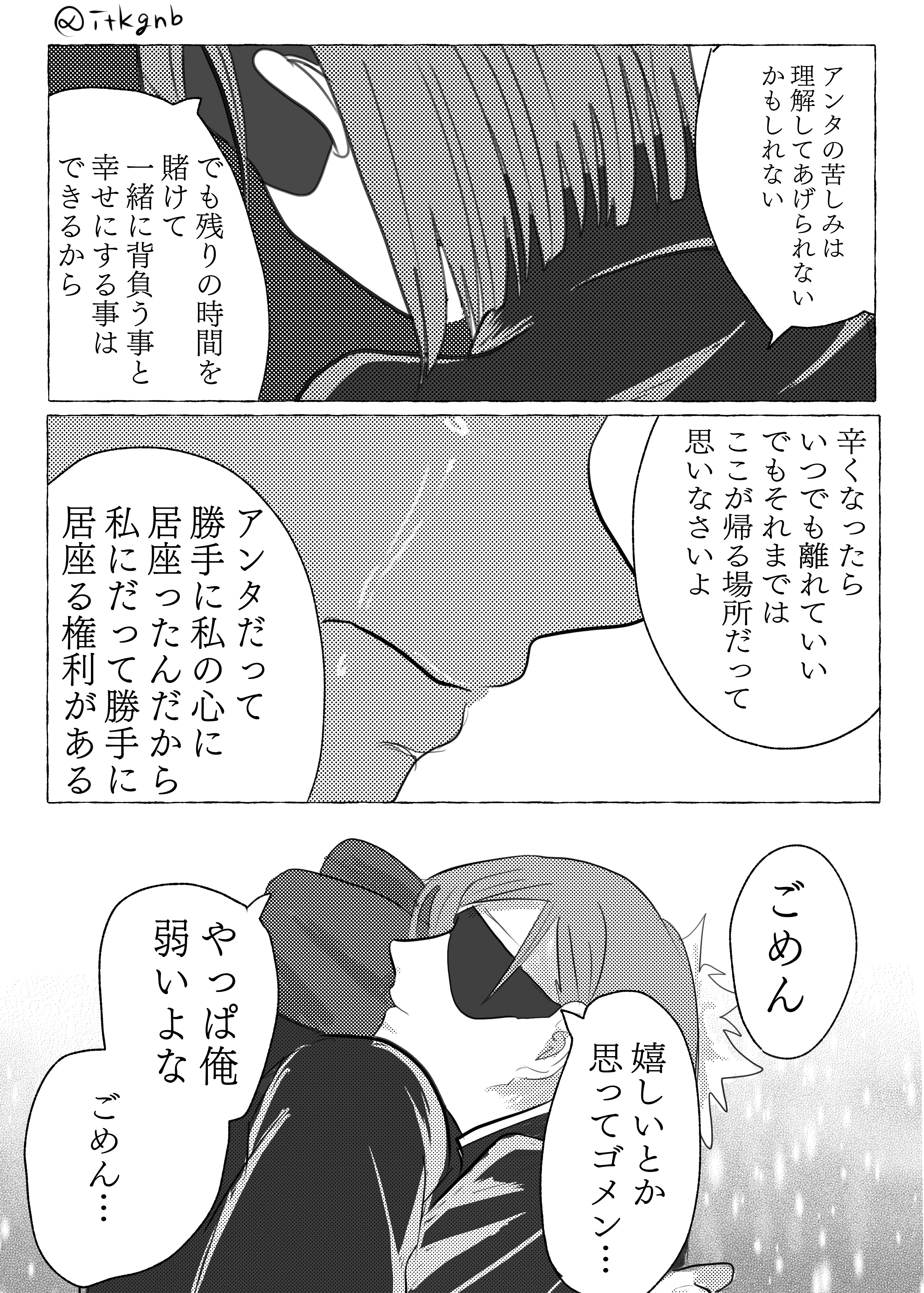 >>287641548>N:I may not be able to understand your suffering>N:But we can spend our remaining time together, bearing the burden and making each other happy.>N:If things get too tough, you can leave anytime, but until then, think of this as your home.>N:You took up residence in my heart of your own accord, so I have the right to take up residence in your heart of my own accord too.>Y:I'm sorry>Y:I'm sorry for thinking that I was happy>Y:I guess I'm weak after all, I'm sorry