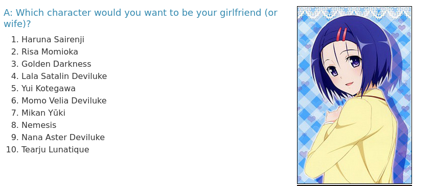 Yui > Yami > Haruna > Tearju > Mea > Mikan > Lala are the only good ones, in that order. Rest are irrelevant and definitely below a 7/10.