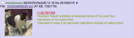 >>287802920>He can take solace in knowing that no one bought TLR for the writing.Yabuki didn't write To Love-Ru outside of the 2023 one-shot. He only drew it.
