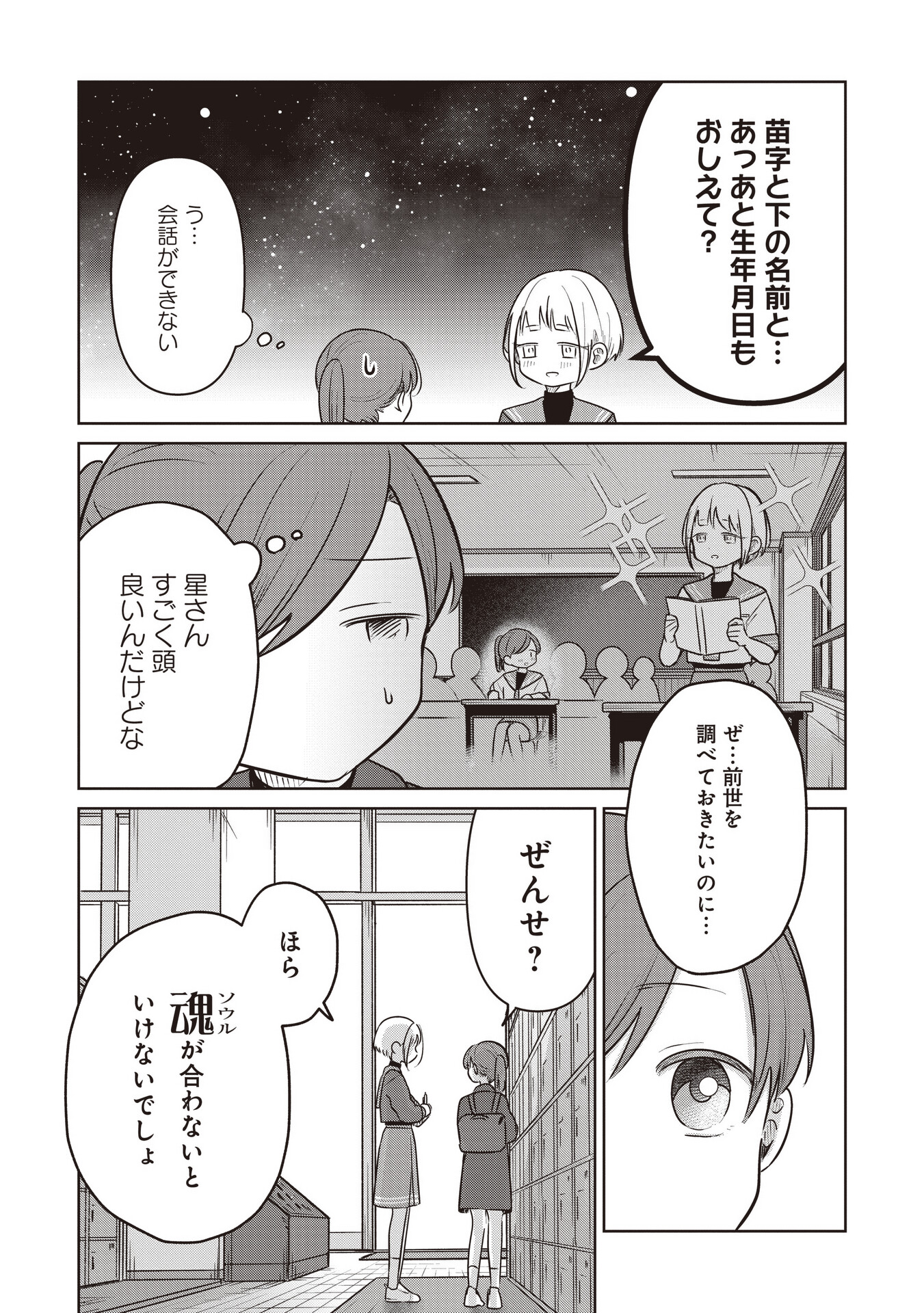 >>2828584888:Tell me his family name and given name… a-and also his birthday year, month, and day?Ugh… I can’t get through her.Hoshi-san is supposed to be smart, so why… I want to look into his p-past lives…Past lives? [she repeats the word in Hiragana indicating it’s a term she’s not familiar with/wasn’t expecting to hear]Yeah!Our ~souls~ have to be compatible, right? [the big kanji is the japanese word for soul, tamashii, but she’s pronouncing it as “souru”. very chuuni]