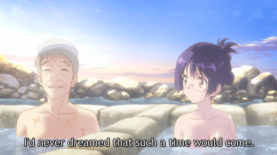 >>282897583Yeah. It's a mixed bathing onsen and with no walls either. The girls and the old man just perform a height free spirited living. They get naked and soak in the hot spring in the open air. If they had added TKB I'd call it one of the most normalized and casual acts of public nudity I've ever seen in anime. Since they edited around the cast having nipples I have to say they were still treating it as taboo.