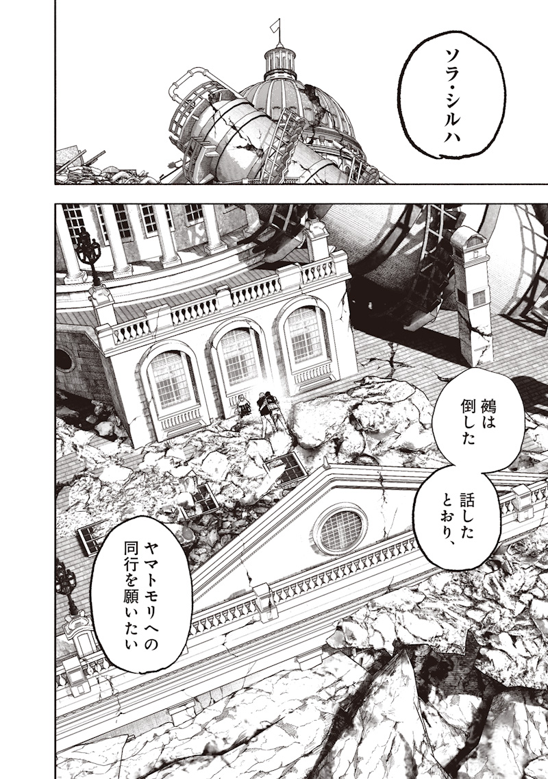 >>282937557>You...>>282937589>Sora Shiruha.>The nue is defeated, and as we've talked,>we wish to accompany you to Yamatomori.>>282937609>There's no need for that.>What... do you mean?>The "mark" wishin me has vanished.>>282937624>B-But I'm not dead?>Won't I die if the mark's gone?>There is /a/ mark.>Within Hoshi Batista,>as he had stolen it.>Therefore, what we have here is>nothing more than a corpse of an old choujin on the verge of death.>>282937653>If you wish for Tsukiko's judgment, bring him here.>However, you must hurry. Batista's life is running thin.