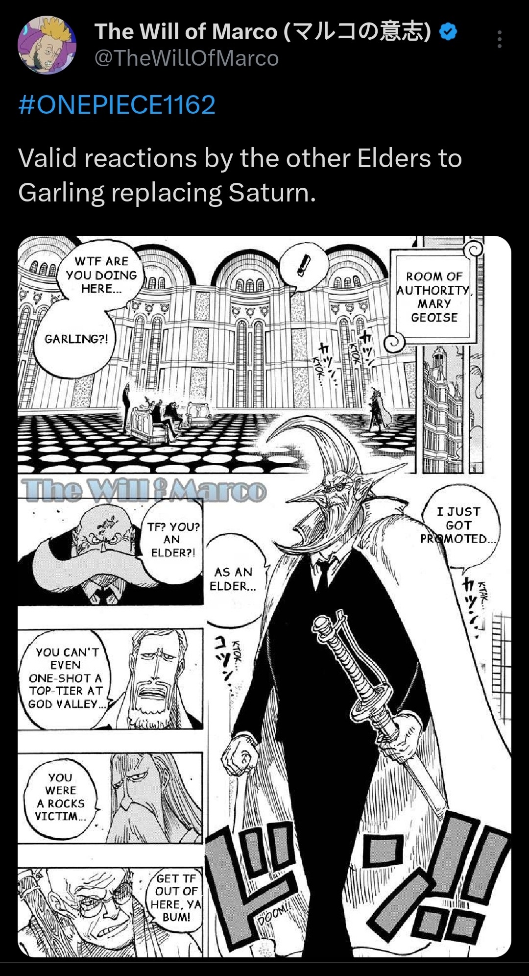 >>282993029Another parallel is that in almost every chapter Garling has been in, Oda's also included Dragon. The only exception was the Kuma flashback which we didn't know at the time that Dragon was in God Valley. But the recent revelation being that the God Valley incident made Dragon cynical about the WG/Marines and Garling being the instigator of it being in GV is a clear setup.