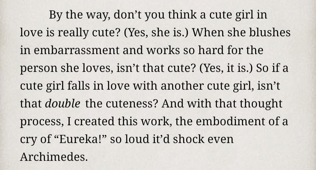 >>283009369What's dishonest about it? As a yurifag, I feel like the average argument for why the yuri romance is more appealing is the faster romantic progression, more physical intimacy is shown, and there is a greater variety of side pairings that act as romantic foils to the leads, especially when compared to the other popular seinen and shounen romances that are popular on /a/. Obviously those series have positive qualities too (better art quality, longer length, and allows self-insertion), but if you value the three qualities I listed before, it seems like a no-brainer as to why people enjoy yuri more.