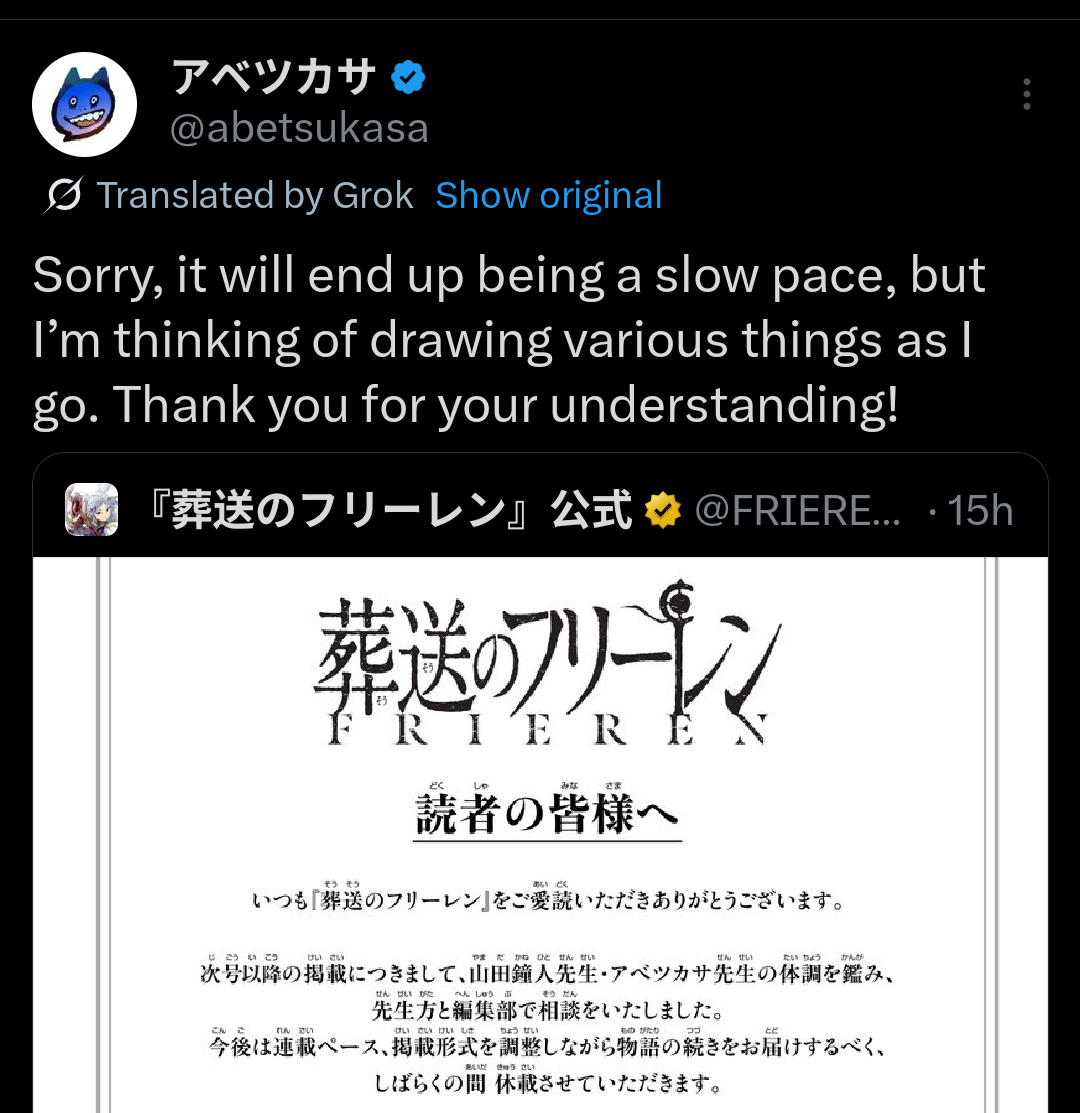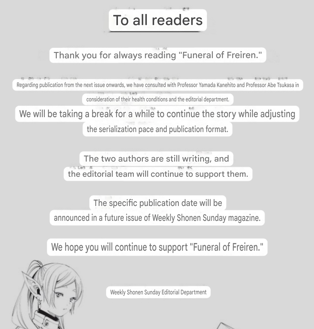 >Frieren at the HiatusThe manga ends here. These japanese cold ridden middle aged men really took a year long break, dropped three chapters, and succumbed to the itis. You will not see another chapter.