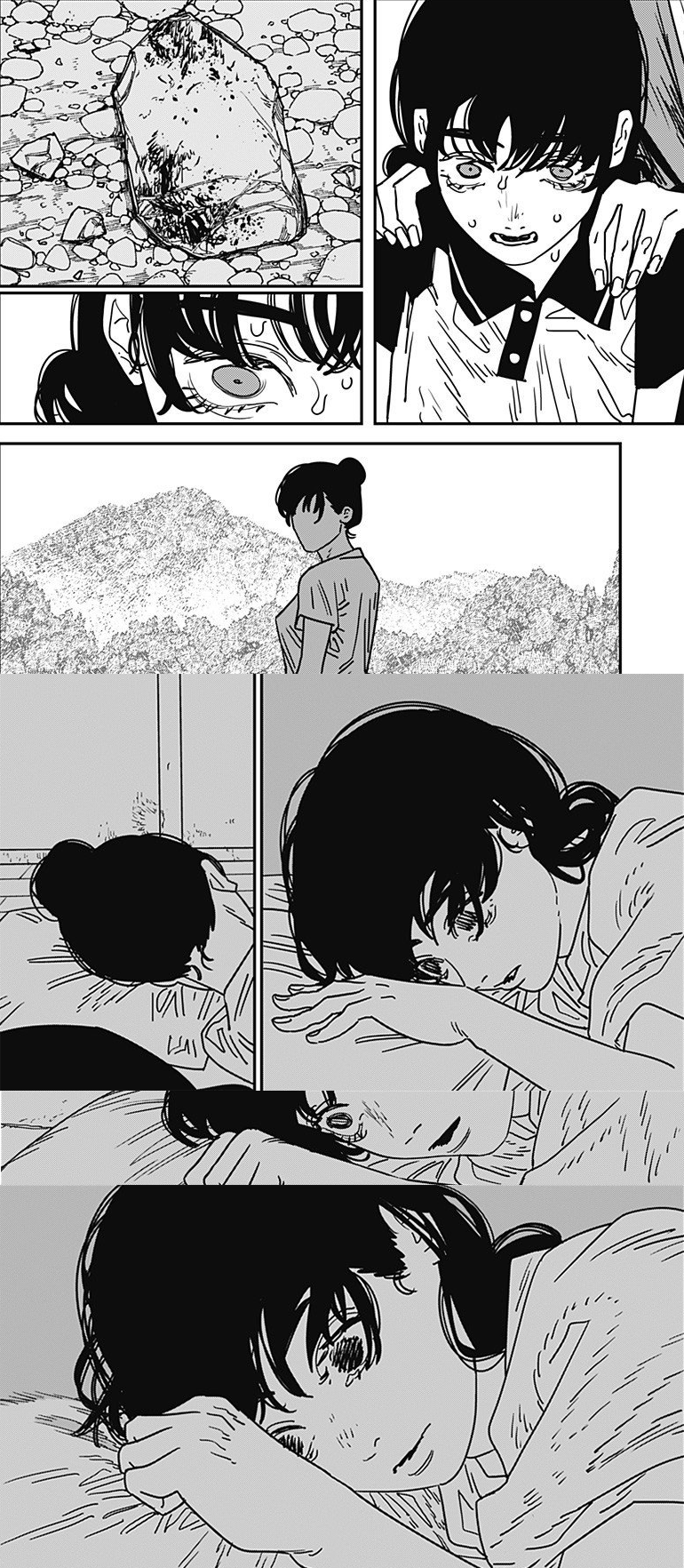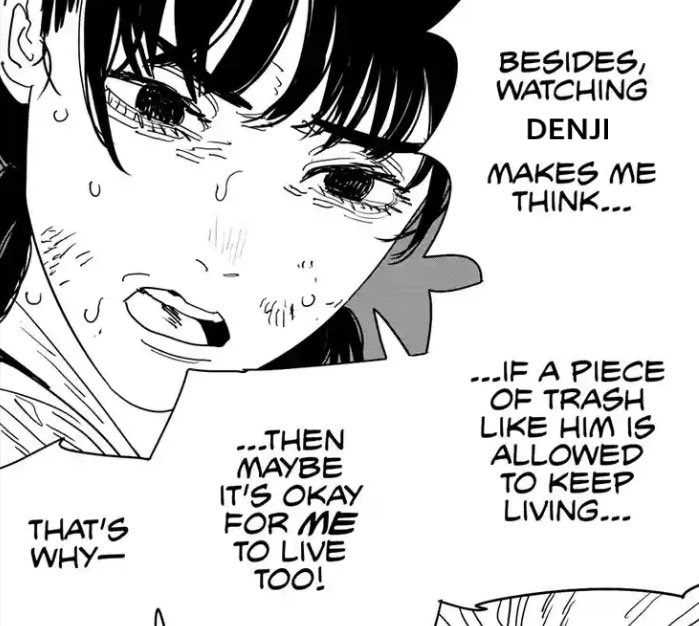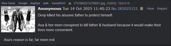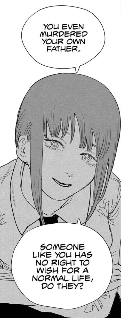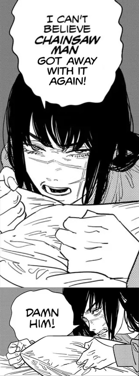 >Asa's mother killed her father for the insurance payout, and Asa internalized the guilt>Asa's mother died when Asa tried to rescue a cat from a devil, and Asa internalized the guilt>Now she's determined to try and be a good person, but doesn't know what that means because her efforts to be objectively good lead to misfortune and the cases of subjective goodness that she's witness to, which are often objectively evil, lead to great gain for her>This is on top of having a devil hijack her body and go on a rampage, and her unresolved feelings towards Denji, which she's also subconsciously rejectingAt least Denji made peace with killing his dad. Hope he can help Asa.