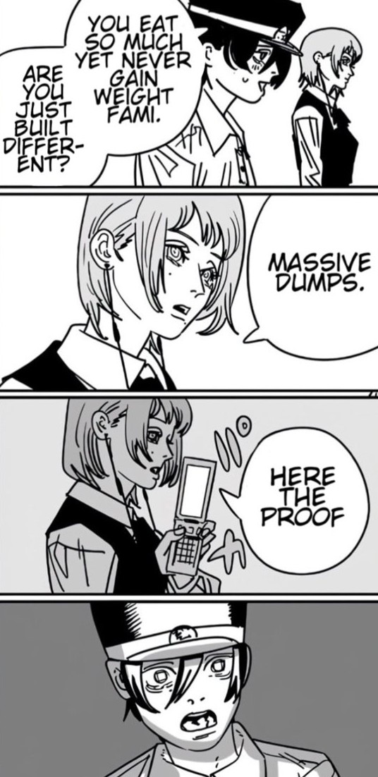 >>283035408>Deliveries are flat all round and everything feels rushed as fuck.Remember Asas reaction to the reveal of Denji=CSM?It was 1 panel KEK