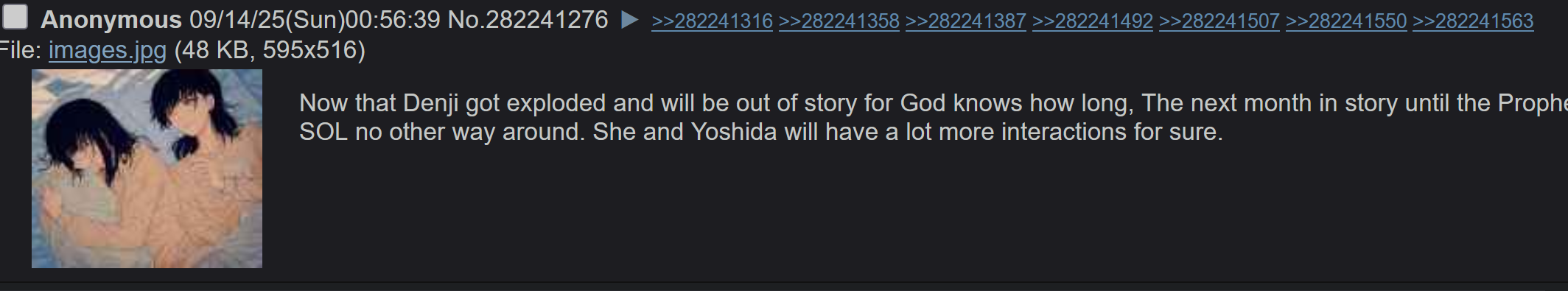 >>283035096This is Poo (You can recognize him from either his seethe towards Nayuta, gay love for Denji or the word "Pedo", he is the only that uses it here)