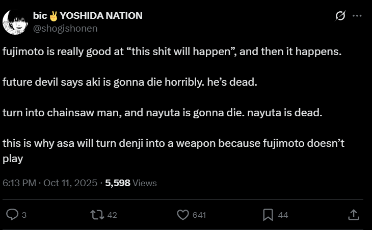 >>283034807feels kinda repetitive to just kill denji's family again, fujimoto is better than that