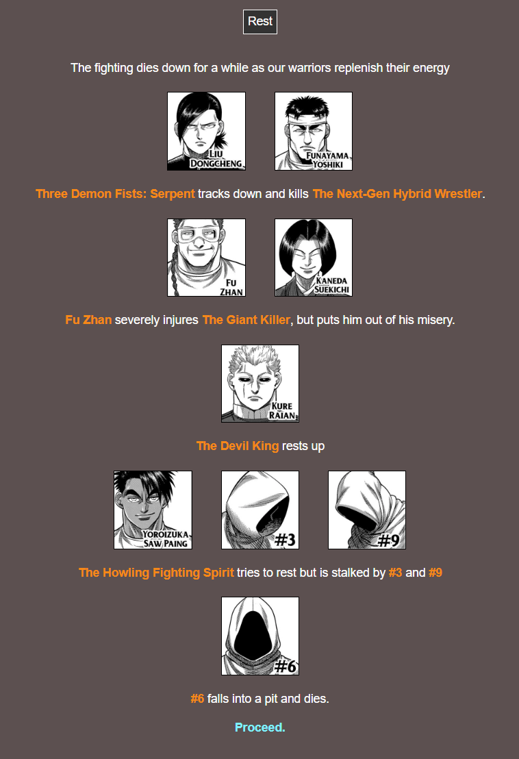 >>283049406Final kill countIf you want to run simulations yourself, here's the link. You can also edit anything you didn't like, but setting up events takes a lot more time than I thought.https://brantsteele.com/hungergames/classic/r.php?c=h4CriYbUYou can also go to Load Season and enter the code "h4CriYbU">>283049442It definitely is hard to find a right balance, I agree
