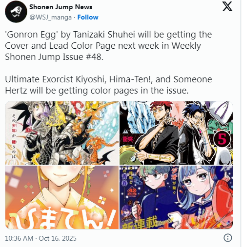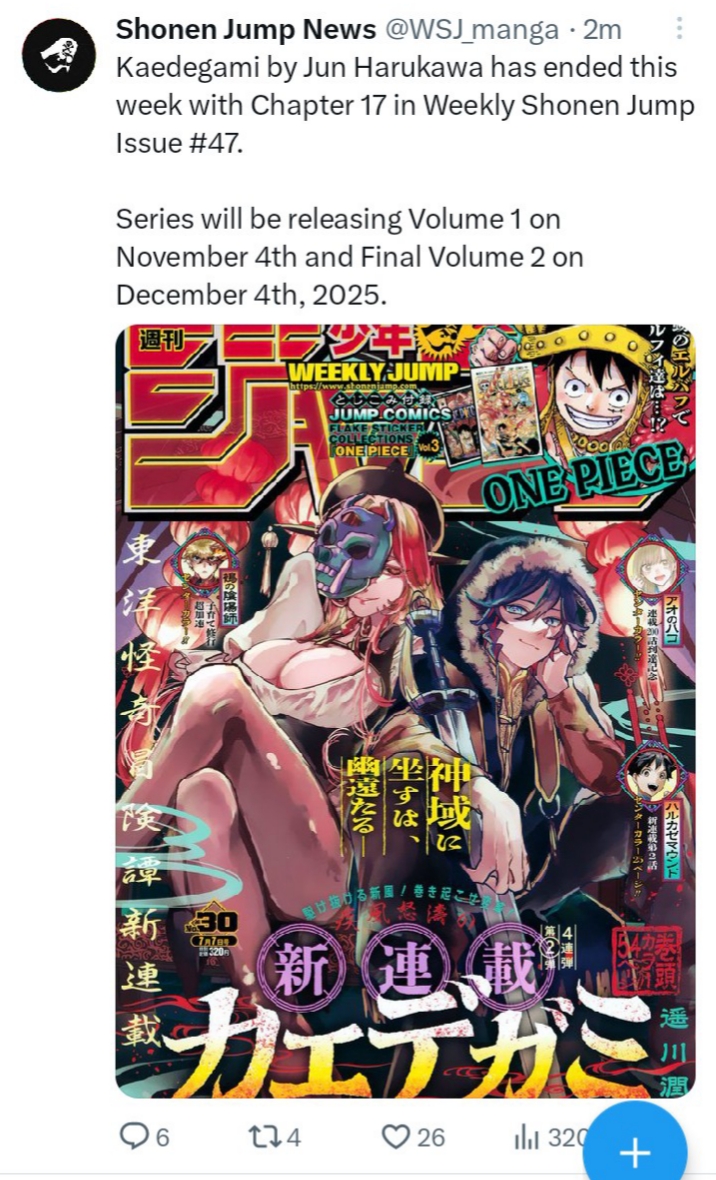 November volumes>One Piece #113>Me and Roboco #24>Akane-banashi #19>RuriDragon #4>Kill Blue #12>Nue's Exorcist #12>Ultimate Exorcist Kiyoshi #6>Hima-Ten! #6>Shinobi Undercover #5>Nice Prison #2 (final)>Otr of the Flame #2>Harukaze Mound #1>Kaedegami #1>Ekiden Bros #1>Ping-Pong Peril #1December volumes>Sakamoto Days #25>Witch Watch #24>The Elusive Samurai #23>Blue Box #23>Kill Blue #13 (final)>Ichi the Witch #6>Kaedegami #2 (final)