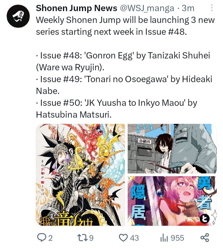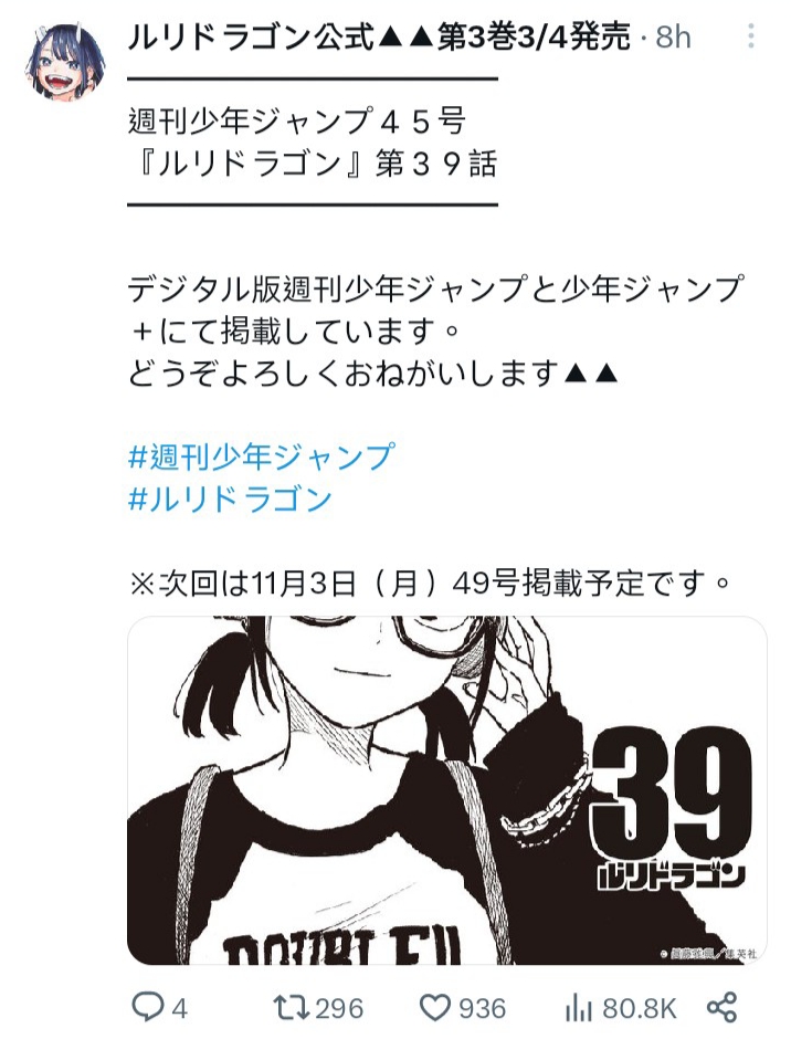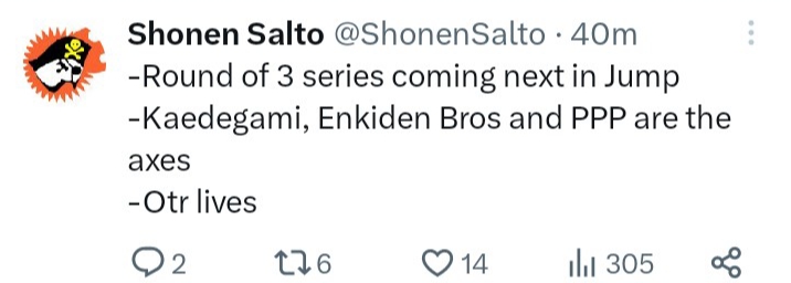 >>283062714>Author still refuses to use popular charactersDamn this magazine is fucking cursed, they really need some new big thing alas MHA and JJK at least