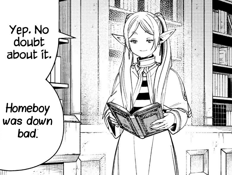 >>283065337>"demons are evil by nature"It's true that Frieren herself describes them as this, though it's more accurate to say that they are psychopaths by nature. They seem senselessly cruel to humans because they truly do not experience any sort of empathy or other forms of emotional attachment. Examples like the story Frieren herself gives about the mayor and the demon child are a great showcase how alien a psychopath's mindset seems to a normal human. Likewise, because they fundamentally do not experience "trust" on an emotional level, they see nothing wrong with cheats, lies, and betrayals since these are all methods by which one can advance their own personal interests. Additionally, because they believe that they are individually strong enough to defy "the law" (of the local land) and kill people, there is little reason for why they should not do so for immediate gain. Because the societies of other races are built upon base tribal instincts that the demons don't have, they are antithetical to these societies and are therefore considered reasonably blanket-labeled "evil" as a consequence.In real life, psychopaths without violent tendencies tend to do well in business precisely because they can be perfectly nice whenever they need to be and be ruthlessly efficient without any remorse. This is not only told well by Frieren insisting that demons are monsters that have mastered the art of lying, but also shown well with just how easily the demons are able to negotiate their way into the city with honeyed words and cultured looks alone. The demons might not feel anything, but the humans sure make emotional attachments easily, and are thus easily tricked into thinking "maybe these ones are different" or "not all demons are bad" simply because they ascribe human thought processes to demons, who do not possess that capacity.In this capacity, Frieren maintains its depth and nuance, as demons aren't simply "evil", they're a race of psychopaths.