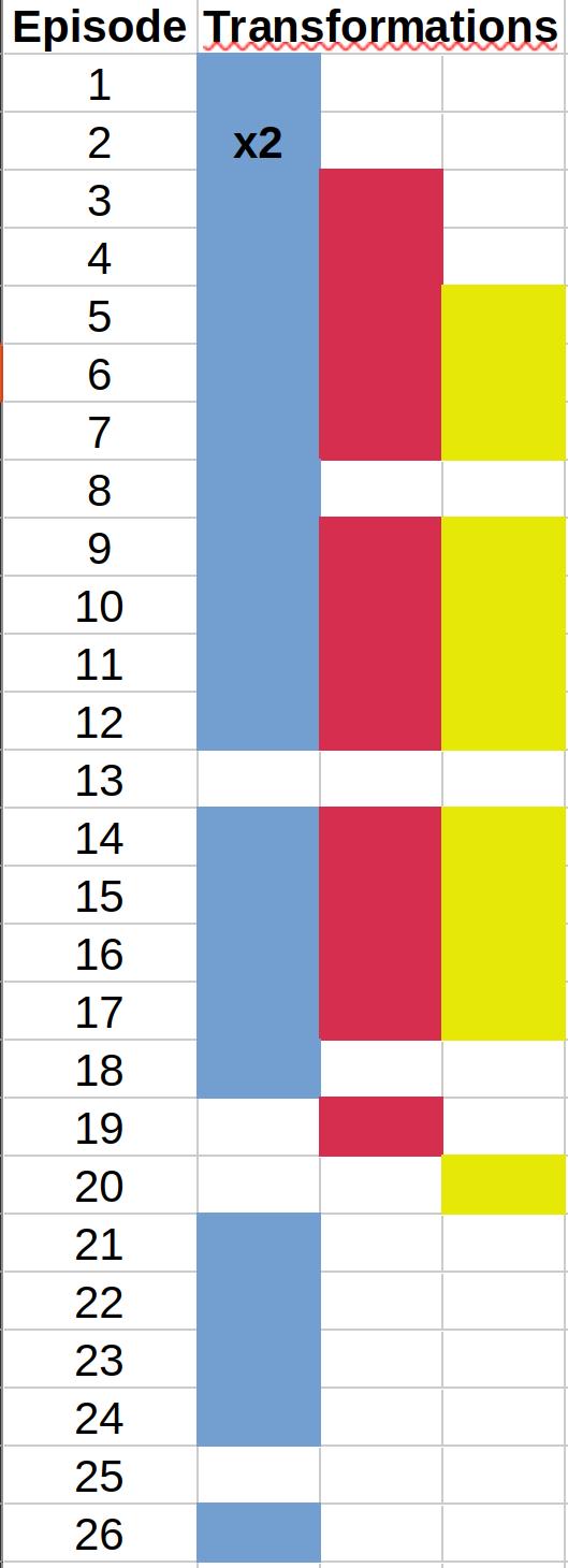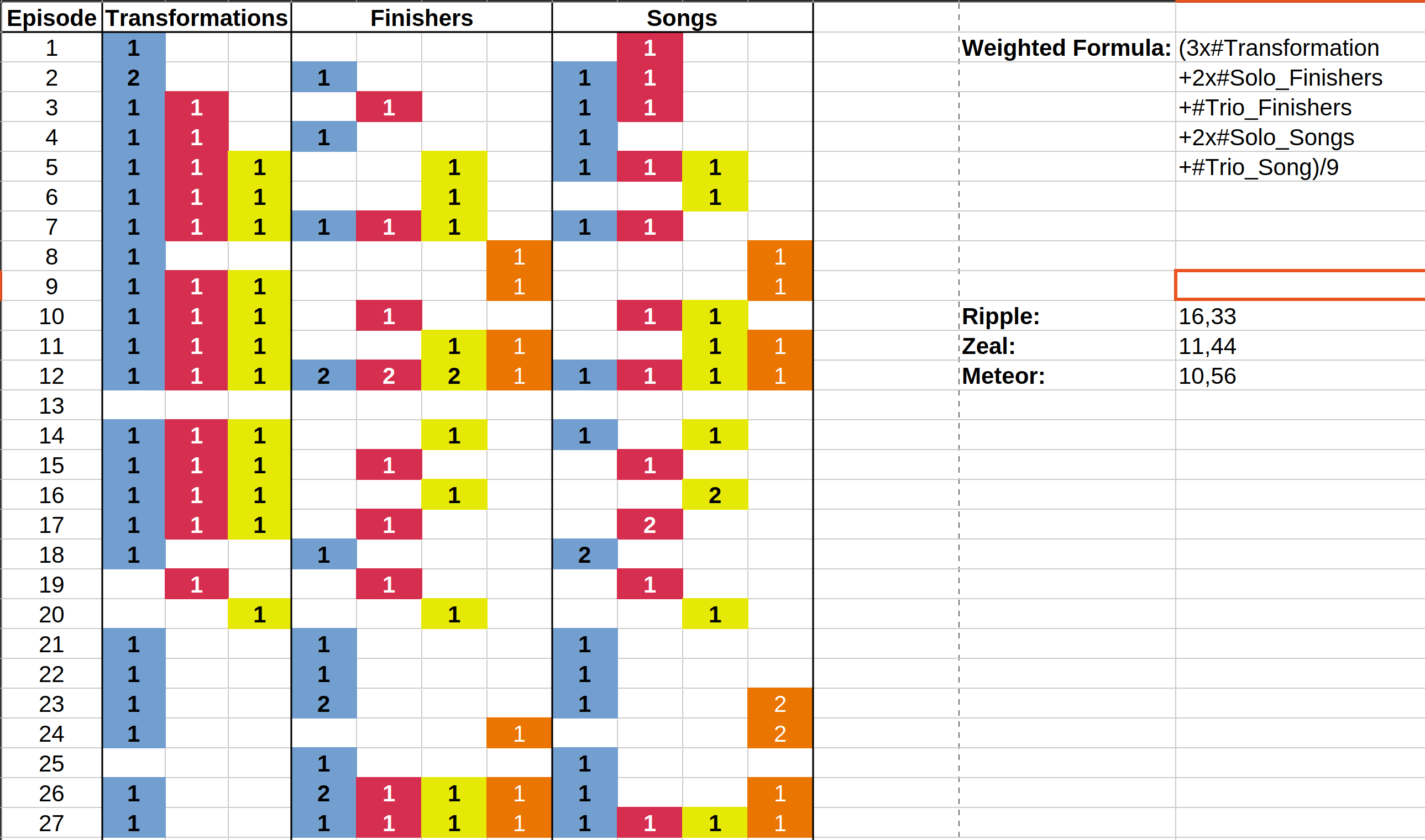 I tallied every transformation, song and finisher to get a feeling on how much Ripple has been favored over Zeal and Meteor. For the first 20 episodes, it wasn't that bad. But after that it was all Ripple, Ripple, Ripple. Hopefully this episode marks the end of that streak, even though ONCE AGAIN, Ripple was the only one to have her transformation shown. For the scoring, I weighted transformation as x3, solo songs and finishers as x2. The orange fields represent all trio songs and finishers, like Triad Force and Super Higher Dreamer.