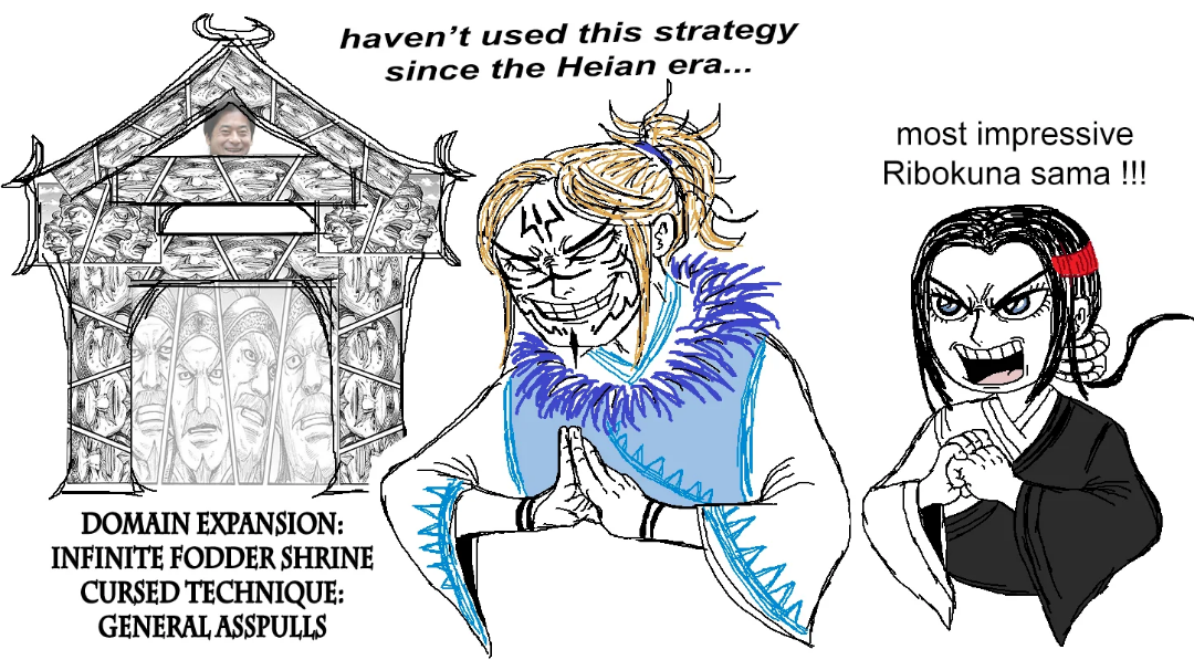 >>283097982i need to reread the manga. i can't remember Riboku sama ever losing a battle.but there are mant cringe chapters that i'm not looking forward to slogging through again like all the Houken appearances so i haven't started rereading it yet.