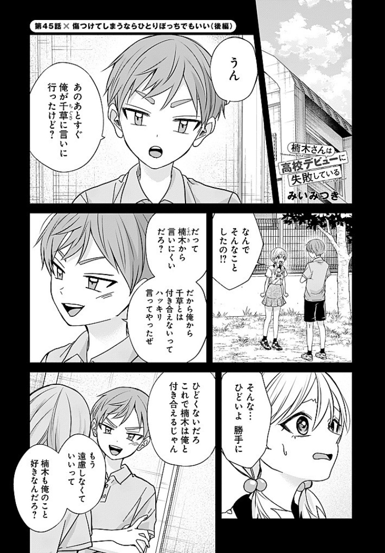 2nd part of chapter 45 is out and it's a pretty short one>Hey, right after that, didn’t I go tell Chigusa myself?>Why did you do something like that!?>Because it would’ve been hard for you to say it to Chigusa, right?>So I just went ahead and said it for you—told her clearly that you wouldn’t be seeing her anymore.>That’s awful… You did that on your own…>It’s not awful. Now you can go out with me, right?>You didn’t want to keep your distance from me, did you? You like me too, don’t you?what a fucking prick this dude is