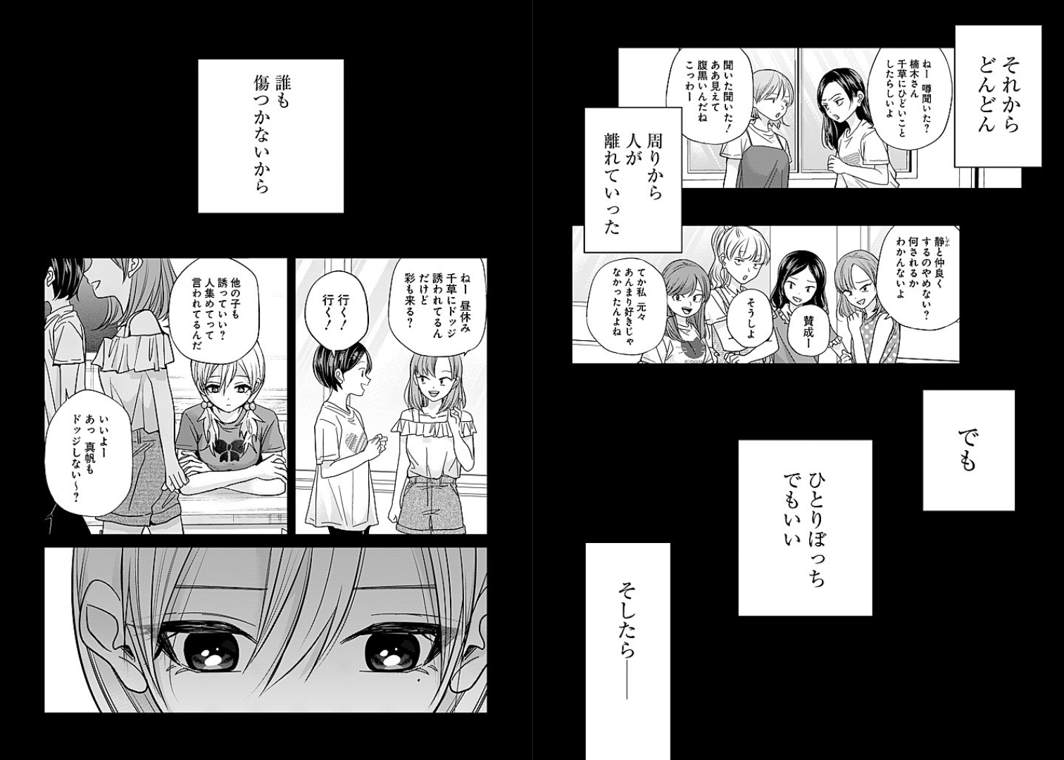 >>283083222>After that, little by little,>"Hey, did you hear? Kusunoki-san said something really mean to Chigusa!">"Yeah, I heard! She totally looks like she would—such a fake!">people started to drift away from me.>"Why do you even hang out with Shizuka anymore? Who knows what she might do next.">"Totally agree.">"Honestly, I never really liked her that much anyway.">But—It’s okay…>even if I end up all alone. Because then—No one would get hurt.>"Hey, during lunch break, Chigusa invited me to play dodgeball — are you coming too, Aya?">"Yeah! I’ll come!">"Can we ask other people too? We were told to invite everyone.">"Sure~ Oh, Mahiru, you playing dodgeball too?"