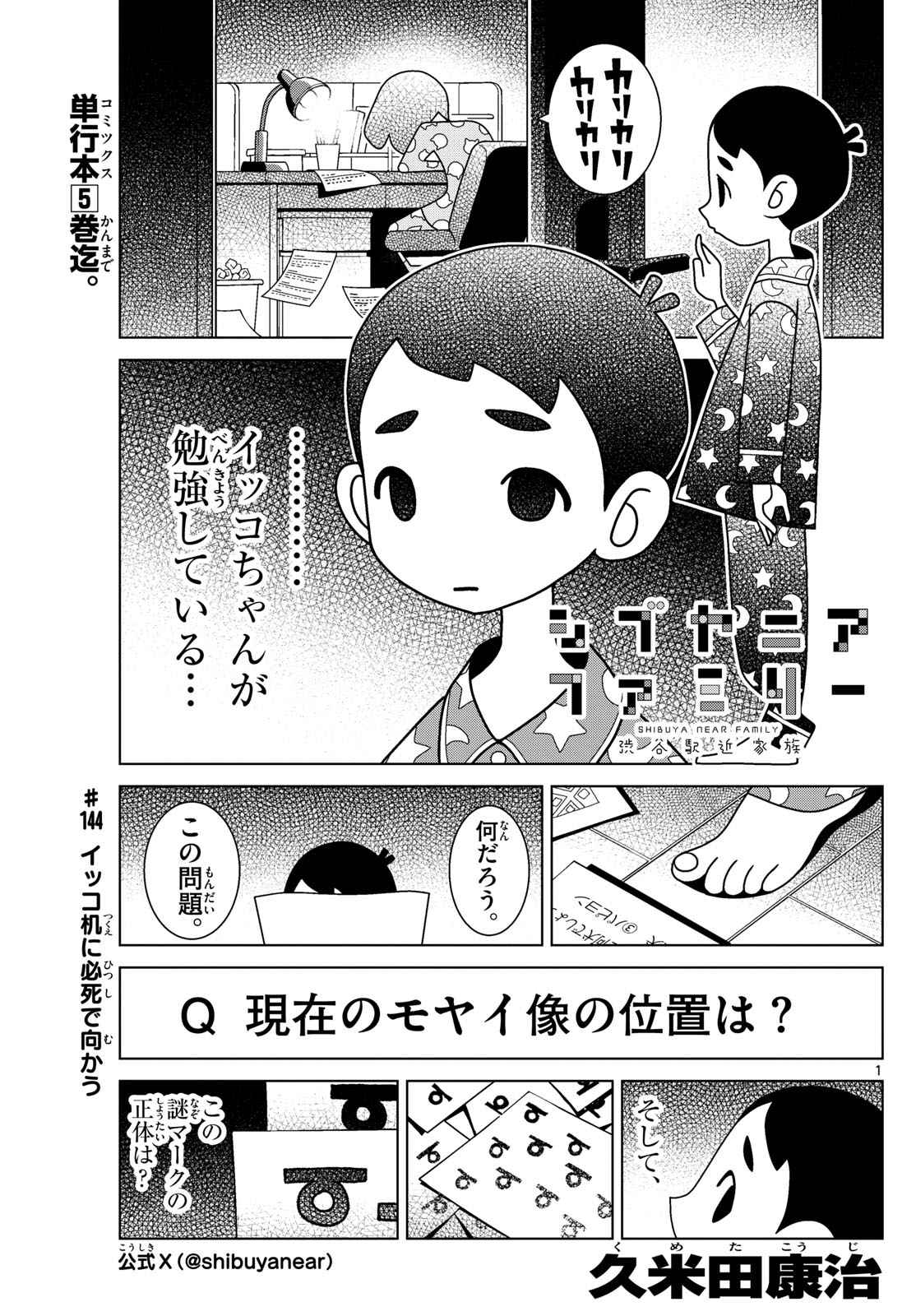 Back from Kumeta's break.Shibuya Near Family chapter 144: Ikko works frantically at her desk>*Scribble scribble*>...Ikko-chan is studying...>Paper: What breed of dog is...>3. Papillon>Wait.>What's with these questions?>Q: Where is the moyai statue currently located?Moyai are stone statues from the village of Niijima, modeled after the Easter Island moai statues. One well-known moyai was until recently situated near Shibuya Station.>Also,>What's the meaning behind these mysterious symbols?