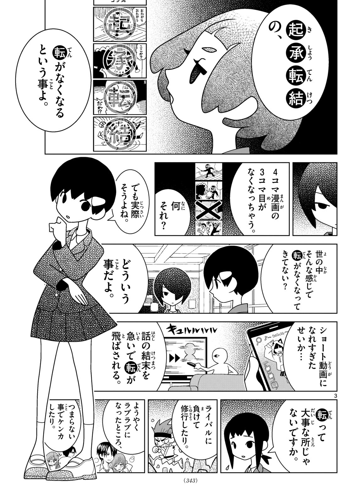 >Is like taking *ki-shou-ten-ketsu*,>and removing the *ten*."Ki-shou-ten-ketsu" is a traditional Japanese (and Asian) four-part storytelling structure. Its four parts are introduction (起, "ki"), development (承, "shou"), twist (転, "ten"), and conclusion (結, "ketsu").>It's like taking a yonkoma, and removing the third panel.>What's that supposed to mean?Yonkoma literally means four panels, and generally refers to a comic with four panels in a single column going from top to bottom. It's a common format for gag manga series and such, and ki-shou-ten-ketsu is a typical way to structure such strips.>Still, I think you're onto something.>I mean, doesn't it feel like a lot of things in the world are losing their *ten*?>Like what?>Like, people who are used to watching short videos...>Fast-forwarding to the end of a story, skipping the *ten*.>But the *ten* is really important, isn't it?>It's the loss against a rival that leads to more training.>Or the couple that has gotten all lovey-dovey>getting in an argument over something stupid.