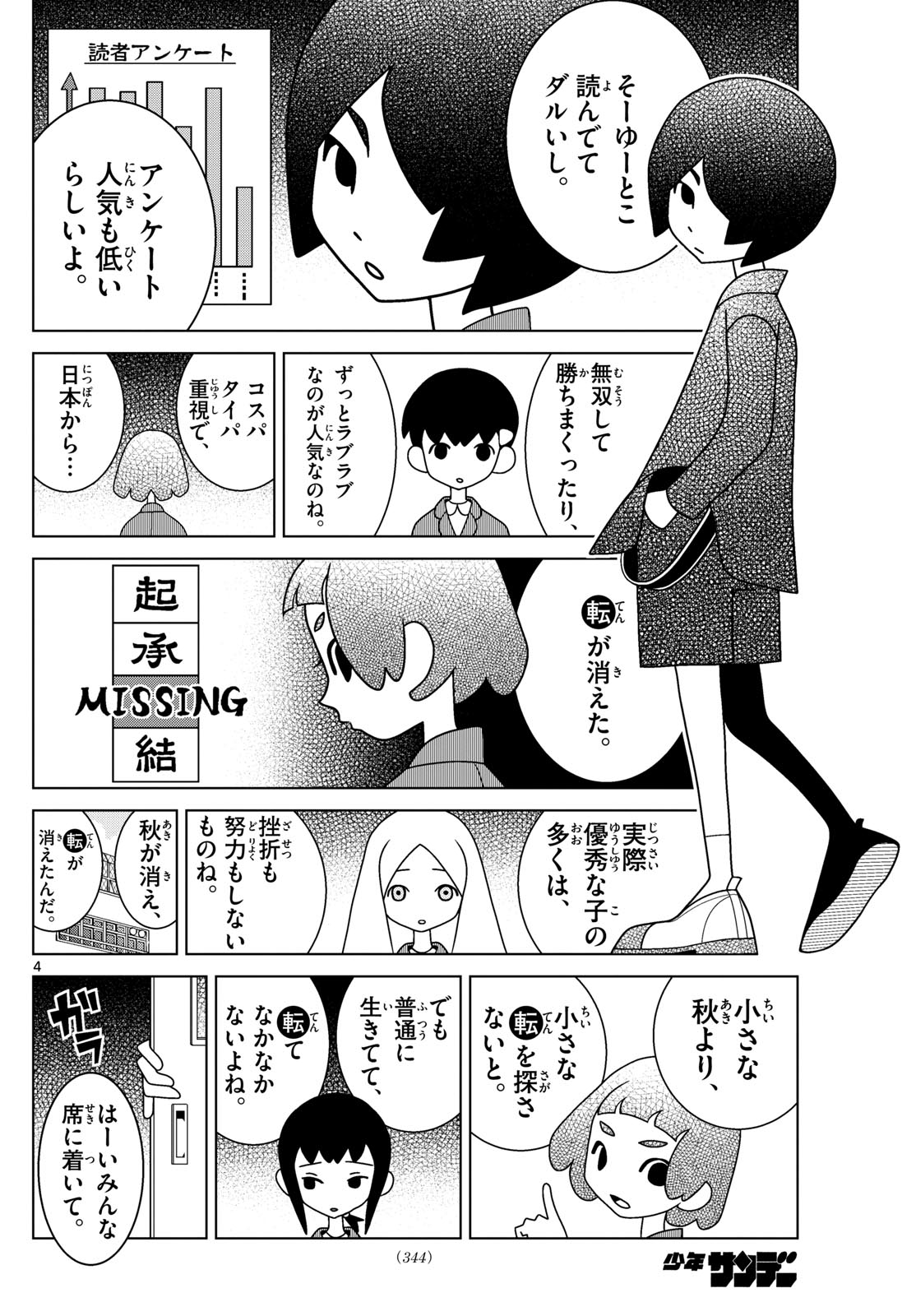 >But, reading that kind of stuff is a pain.>Paper: Reader survey>And surveys apparently show that they're usually not very popular either.>Then, I guess what's popular is winning effortlessly,>or always being lovey-dovey, all the time.>Thanks to our focus on time and cost efficiency,>modern Japan...>Has lost its *ten*.>Top to bottom: Ki, Shou, Missing, Ketsu>Really, since there are so many talented kids these days,>many of them don't ever experience hardship or setbacks.>We're losing our autumn...>Because we've lost our *ten*.>Rather than hoping for autumn,>we should be looking for any *ten* we can find.>But, if you just live your life normally,>you're unlikely to run into any sort of *ten*.>All right, everyone. Take your seats, please.