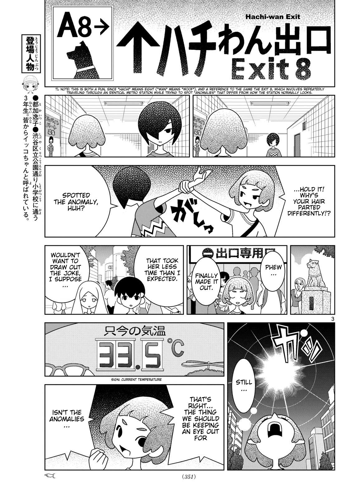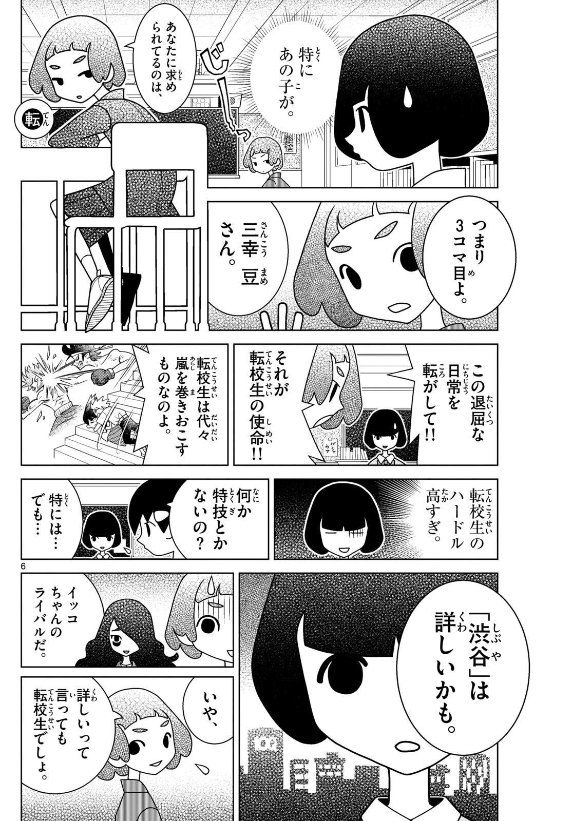 >That girl in particular...>(*Staaaaaare*)>I've been searching for someone like you,>*ten*.>To put it simply: You are the third panel,>Sankou Mame-san.Her name is evidently a pun on "san koma me" (3コマ目), which means "third panel".>Now come, turn the boring routine of our daily lives upside-down!>That's the duty of the transfer student!>Since time immemorial, transfer students have been the ones to get involved in all sorts of commotion!>My job as a transfer student just got a lot more difficult.>Do you have any particular talents?>Talents, huh... Umm...>I guess I know "Shibuya" pretty well.>She really is your rival, Ikko-chan.>N-no...>I mean, she says she knows Shibuya well, but she's still just a transfer student, right?