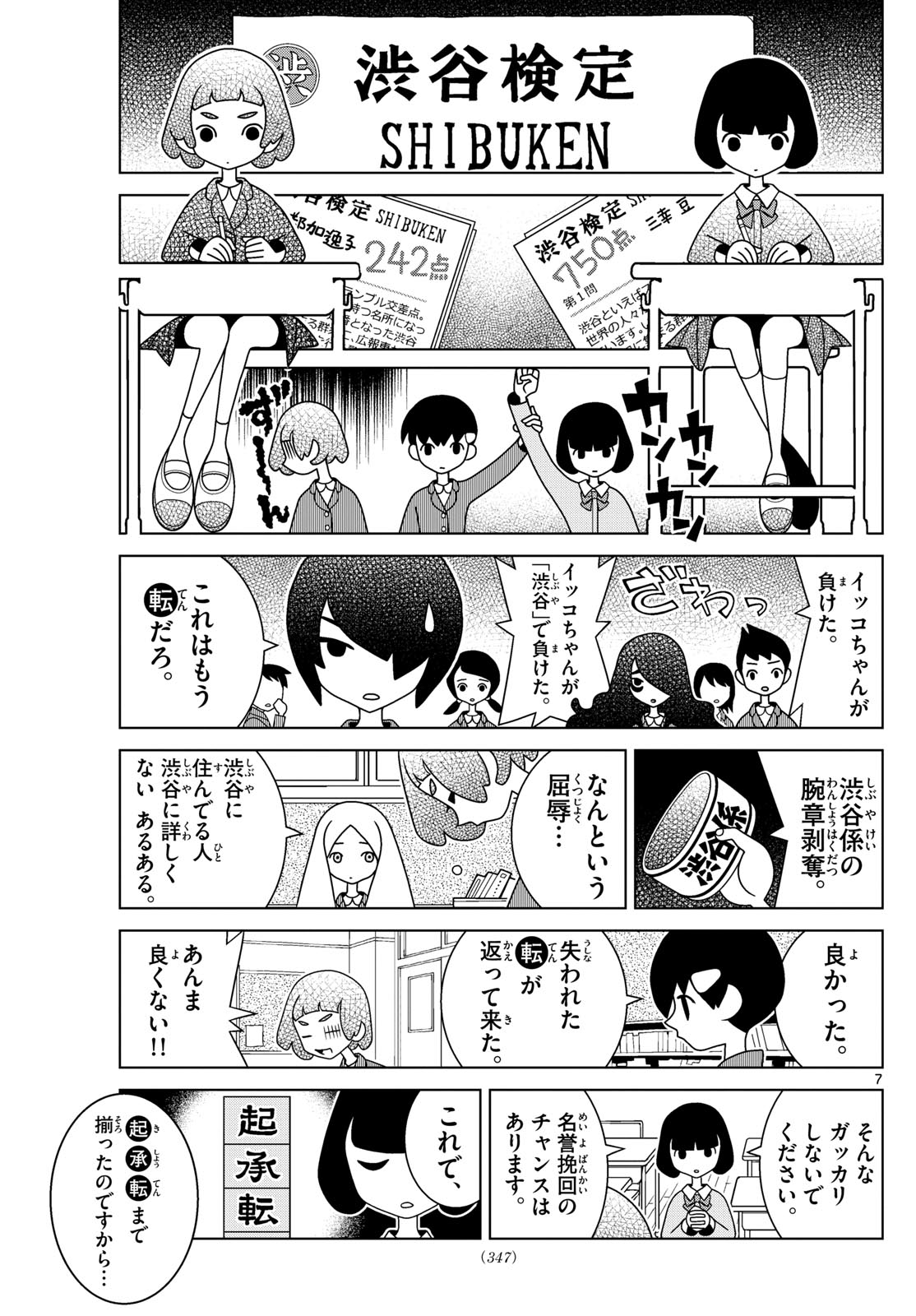 >Paper: Shibuya Proficiency Test - ShibukenThe test seems to be modeled on tests such as the Kanji Aptitude Test (Kanken) or Japanese Language Examination (Goken).>Left paper: Toka Ikko - 242 points. Right paper: Sankou Mame - 750 points.>(*Ding ding ding*)>(*Gloom*)>Ikko-chan lost!>(Gasp!)>Ikko-chan actually lost in a Shibuya competition!>There's your *ten* for you.>You are hereby stripped of your Shibuya Duty armband.>This is so humiliating...!>Well, a lot of Shibuya residents don't know much about the city despite living there.>How nice.>We got our lost *ten* back.>I'm not happy about this at all!>Please, don't be so disappointed.>You still have a chance to restore your honor.>You see,>Top to bottom: Ki, Shou, Ten>now that we've progressed through the *ki*, *shou*, and *ten*...