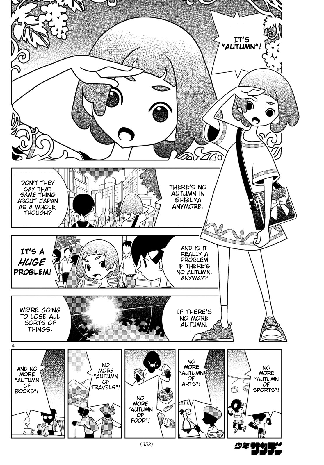 >I'm leaving now.>(*Fwhoooo*)>(*Brrrr*)>It got really cold,>all of a sudden.>Yeah.>It really does feel like autumn has disappeared.>It's not like it's much of an issue or anything, though.>Sure it is.>Taking the four seasons,>Right to left: Spring, summer, autumn, winter >and removing autumn...