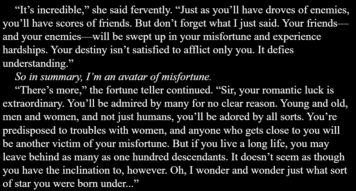 >>283115381But they love him for good reasons.MC is god, everything he says is the absolute truth, he can manipulate fate and read the future.