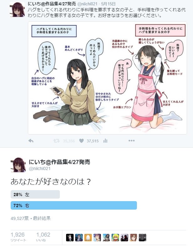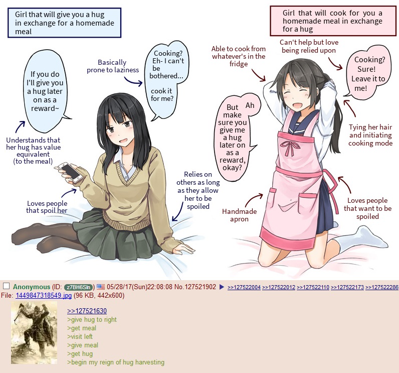 >>283144470The difficulty I have is that both want to be pampered/doted on, they just want it in different ways. Both girls have their charms, but I actually enjoy cooking so I'd probably still go left