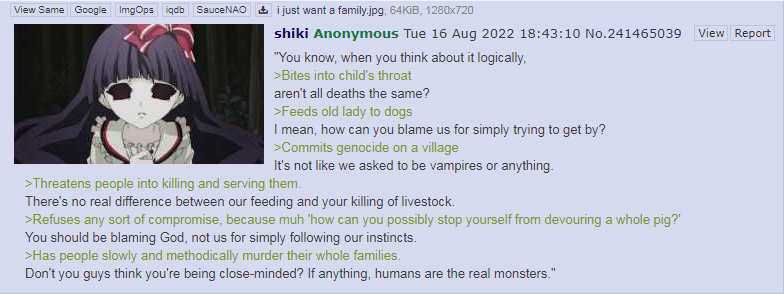 >>283152541>and I don't take the side of the aggressorNobody is forcing you to, or even asking you to.What are you angry at? That the show dared to show you his family? You would have preferred to not see whose death you were cheering for? What is even your complaint?
