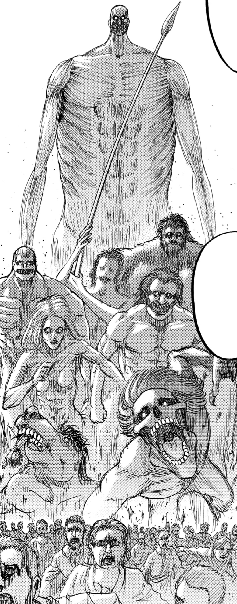 >>283136521To illustrate my point, this is a drawing of a historical retelling of the Eldian Empire attacking Marley. These are all the titans Marley accepted from the Eldian King and used with to terrorize the world and Paradis after they were gifted them. The only one missing is the Founder - the only one Paradis had and Marley sought after.