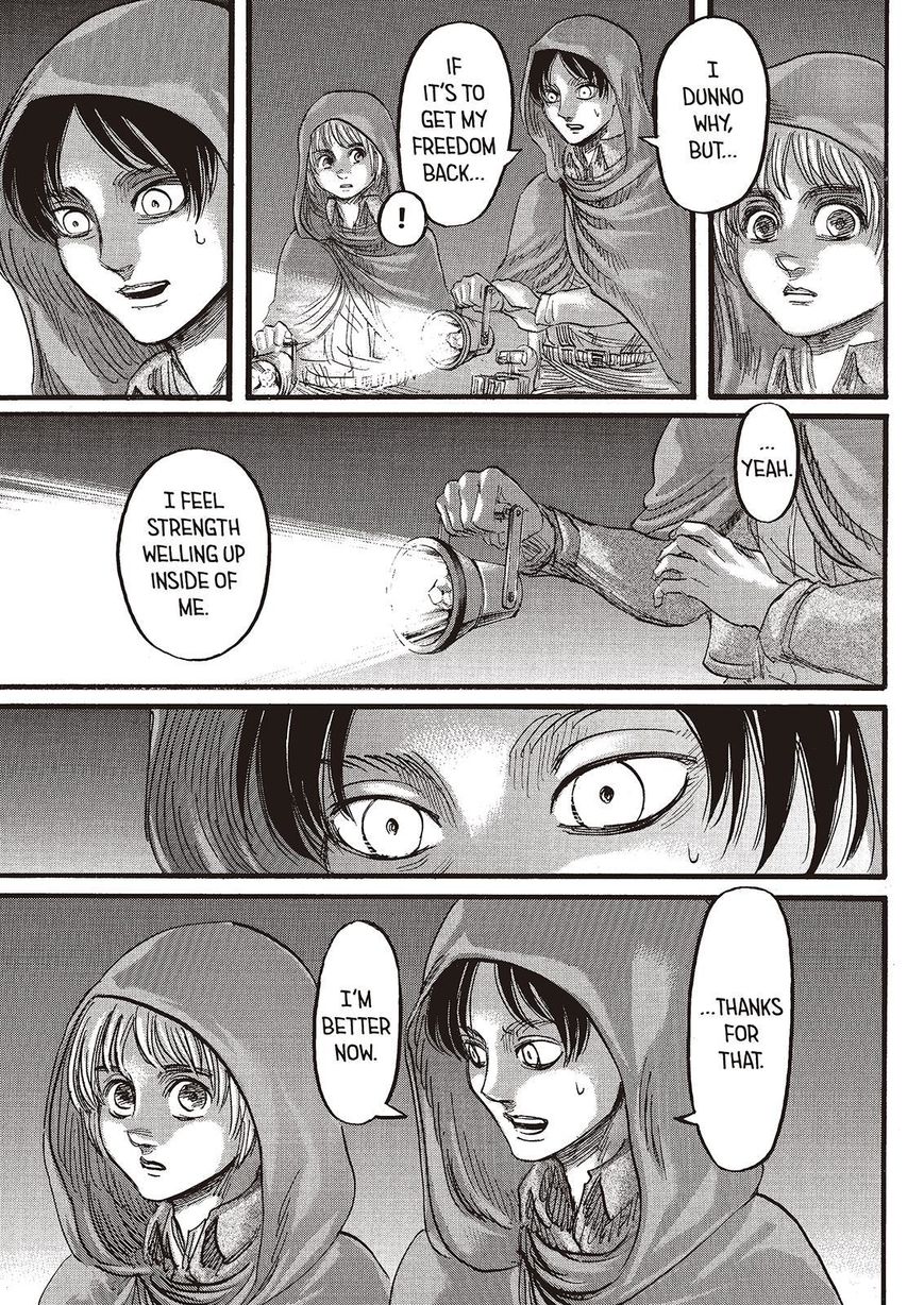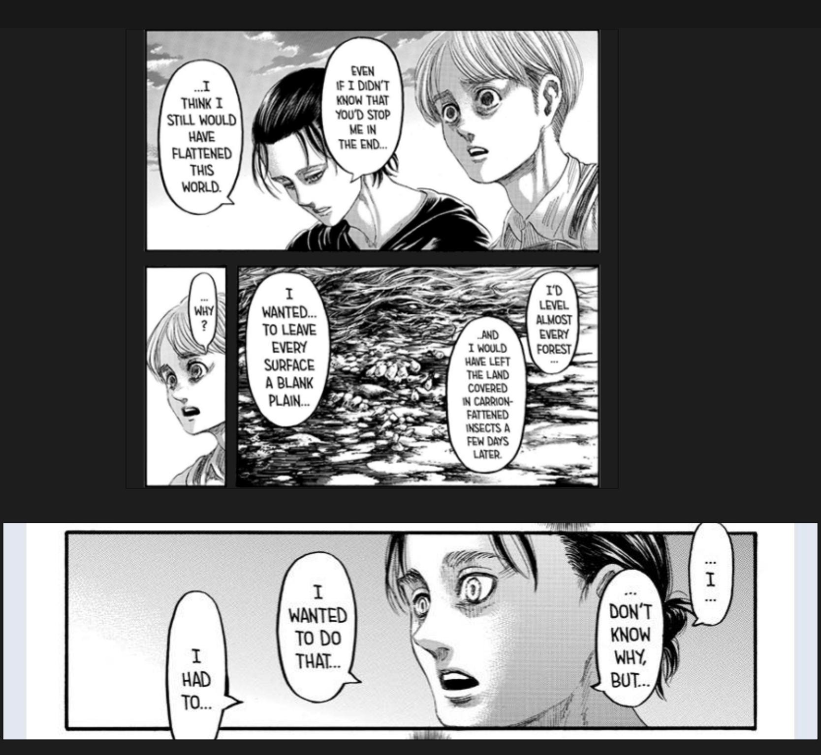>>283151474His line of what? Admitting he didn't understand Eren? Eren saying he was inspired by Armin's book was the platonic ideal of freedom he grew up with, a life outside of the walls where the humanity he grew up with weren't constantly terrorized under the threat of death by titans. How does that translate to wanting to kill everyone outside of them? If he wanted to kill them, why was he in clear distress when he asked that question? Why did he go to Marley and make friends there? Why was he the one in their group most concerned with the wellbeing of the outside world, and being updated on the possibility of reconciliation, who postponed the Rumbling despite their orders in order to buy as much time as he could? If Isayama's goal was writing a genocidal psychopath, he failed and a shock reveal ending doesn't make up for that.
