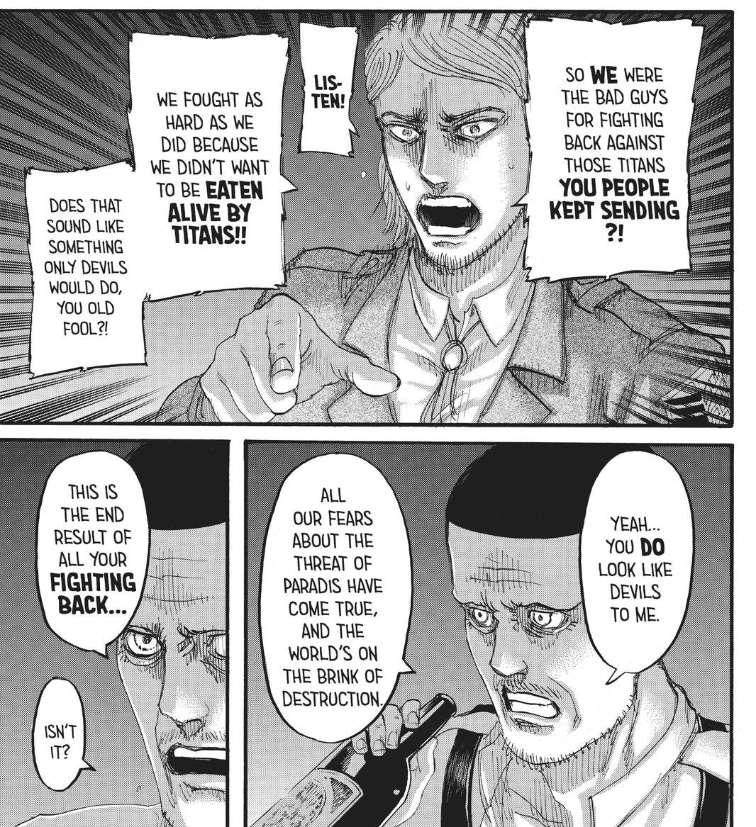 >>283134293I don't think this scene was actually both sidesing it yet. Eren thinks he and Reiner are/were the same because they were both doing what was necessary to protect their countries and to "save the world." Then Reiner drops to his knees and rejects what he's saying. He says Eren's mother died not because Marley actually "needed" the Founding Titan, but because their pure greed and bloodlust as a country prevented them from leaving Paradis alone and that he was driven by twisted ideological forces, not survival, to infiltrate wall Maria. That's why he also begs Eren to kill him. Eren winces in pain at this revelation, but it ultimately supports his decision to go through with the attack once Willy finally declares war on Paradis. The later scene between Gabi/Falco and Kaya parallels this one.