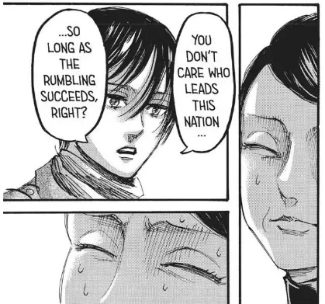 >>283151757Those chinks wanted the Rumbling (as long as it wasn't them!) so long as they could pocket their money kek. Even Mikasa was grossed out