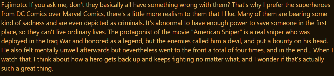 Just how much Fujimoto loves America to let a patriot like Yoru to become the protag of part 2?