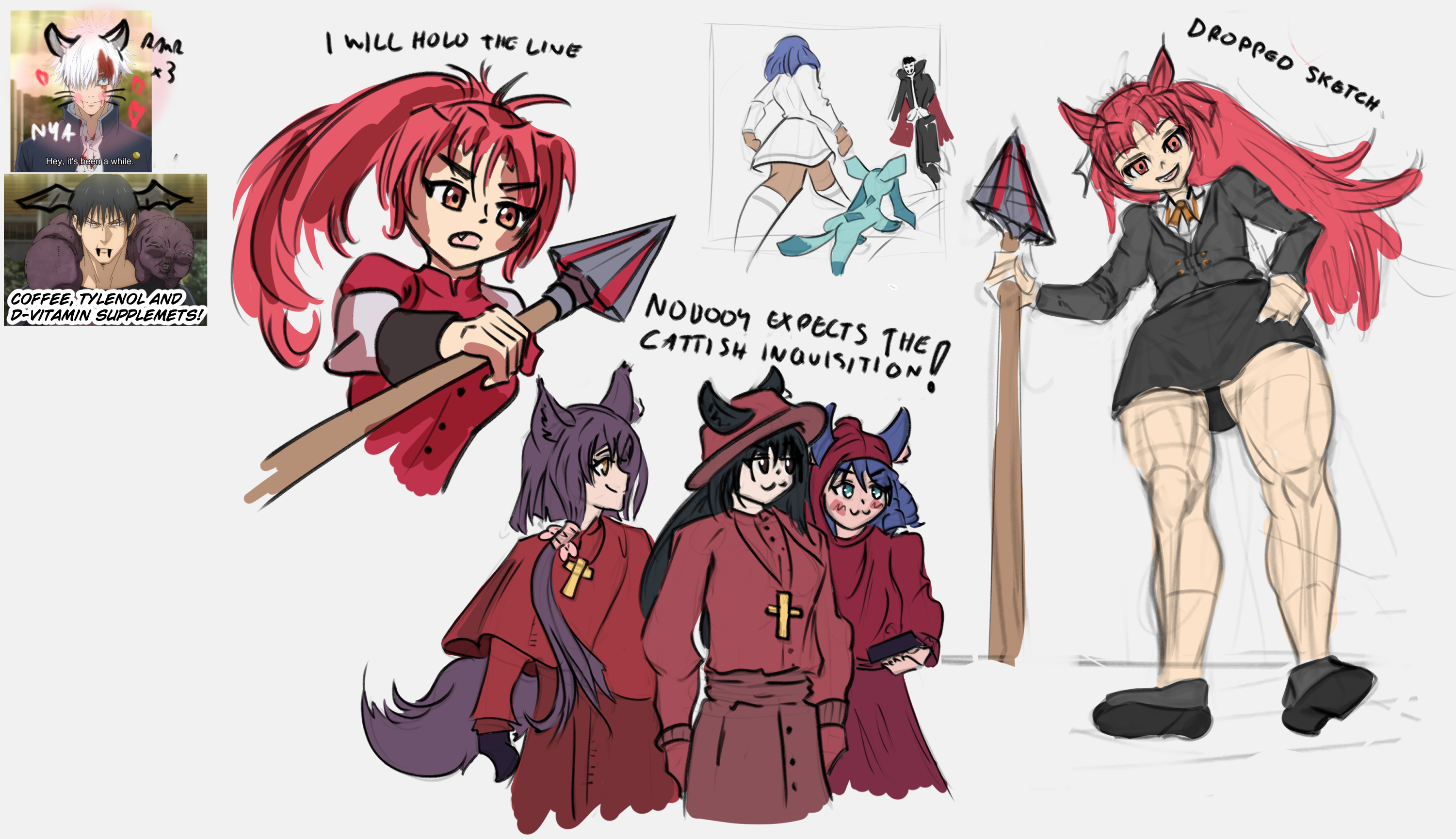 >>283163181Oh wow that's catastrophic for team bat.No one expects the Inquisition! This is honestly making me laugh too damn hard and I shouldn't be awake at this hour. Love the fox ears and her silly ears and tail. Blessed hair draped with holy clothing. I like the little smirk she has with her fellow cat friends. Great job on her hair and making her tail extra big just the way I like it. Would let her interrogate me. I dig the colors. So cute! Thank you for drawing her in this late night thread. Hope the Inquisition lets you go this rest of the weekend!