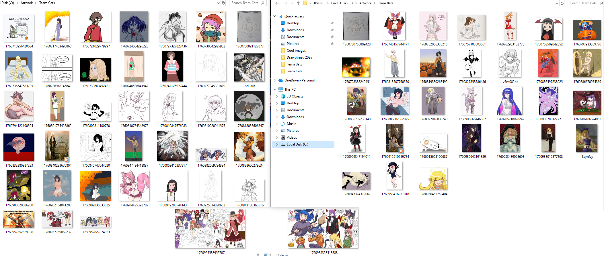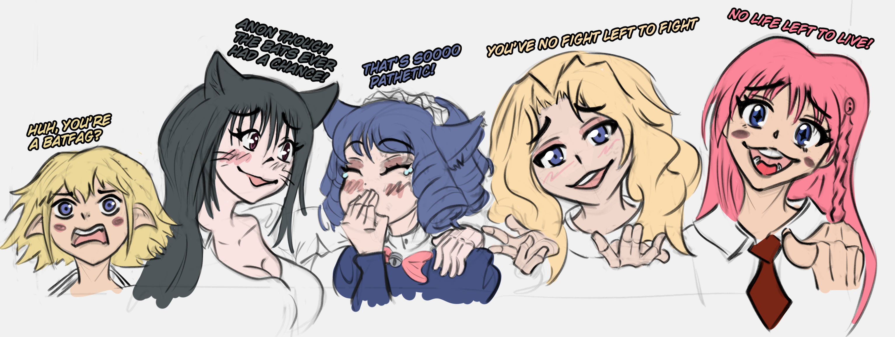 It's the final hours folks.THE CATS VS THE BATS!Team roster: https://pastebin.com/ckJbpqXyYou can join late now that the roster has been posted.TIMER: https://itsalmo.st/time-for-love-and-peace-uo32RULES AND SCORE GUIDE>Teams earn points by drawing for teammates, drawing for another team will net you no points.>Points will be scored on a tiered system with the full sheet here>Winning team WILL be announced the following weekend.>Just for clarification, this warthread is not an open invitation for everyone to rerequest. Follow the general drawthread etiquette.(Points are per figure)Sketch - 15Sketch with Color/Shading - 20Lined (No color) - 30Lined with color/shading - 40Fully rendered - 50Animated/3D - 75Anything Goes/U - 100ModifiersFloating head - 25% of original scoreHalf Body - 50% of original scoreto thighs - 75% of original scoreBackground - +50% to scoreFirst delivery of a waifubando - x2 multiplierLast day will have a flocko/magma where all points are doubled (with the first drawing of a waifubando on that flocko being doubled as well for a 4x multiplier) as merely a way to rack up bonus points.PROPOGANDA!Can't draw due to any reason? No problem, you can help earn your team points via Propaganda! Make simple edits of movie posters, album covers, and whatever else you can think of!>Propaganda cannot be editing pre-existing waifubando material (either official or fanmade).>Please keep the propaganda civil and clean/SFW, anything less than that will not be tracked.CURRENT TOTAL CATS IN THE LEAD BY JUST 50 POINTSCATS 3048 to BATS 2798.
