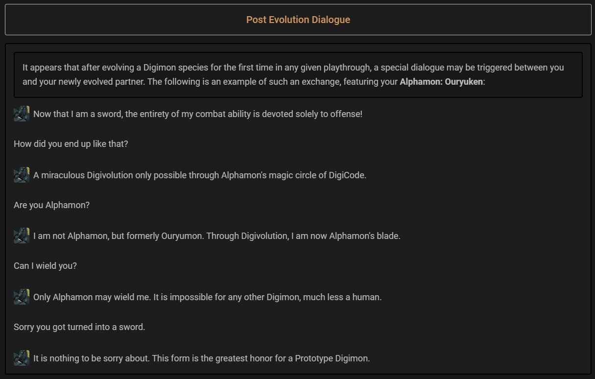 >>283225267>>283225539Cont>gamesModern Digimon has 2 gameplay styles world and story.Story was initially a kids monster collection rpg like pokemon/monster rancher and the like, but with the 5th installment it started targeting an older demographic so it's more like persona/SMT/caligula effect basically a light novel/teen aimed anime when it comes to tone.Most people would recommend with digimon story cyber sleuth and or the recently released time stranger which is doimg extremely well so far.The world games are more akin to a tamagotchi monster raising sim where you get a single mon that you need to feed it, take care of it's literal shit and train it.In world 1 for the psx you have an entire island that you must explore and fight your way through with the mon you raised and cared forNot sure how the sequels play out outside of the monster raising.There is a bit of a divide between digimon fans about which is better.I personally prefer the story games, but I will admit that the world games are far more unique.There is also a game called digimon survive which is a VN with some SRPG fluff to basically have a digimon game that plays out more like the anime(character driven plot where a bunch of kids/teenagers get isekai'd and need to survive with the help of their partner digimon)That basically covers all the modern games.If the story games interest you then play cyber sleuth.If the world games interest you play either digimon world 1 for the psx or digimon re:digitize for the 3ds(there is psp version, but it has less content)Play survive if survive sounds interesting to you.The pre 2010 games are a bit of clusterfuck that can wildly vary in gameplay even within the same series(digimon world 1, 2, 3 and 4 were all different genres and redigitize was basically a soft reboot that standardized the world 1 gameplay for the rest of the series)But like the anime all games are their own standalone entry